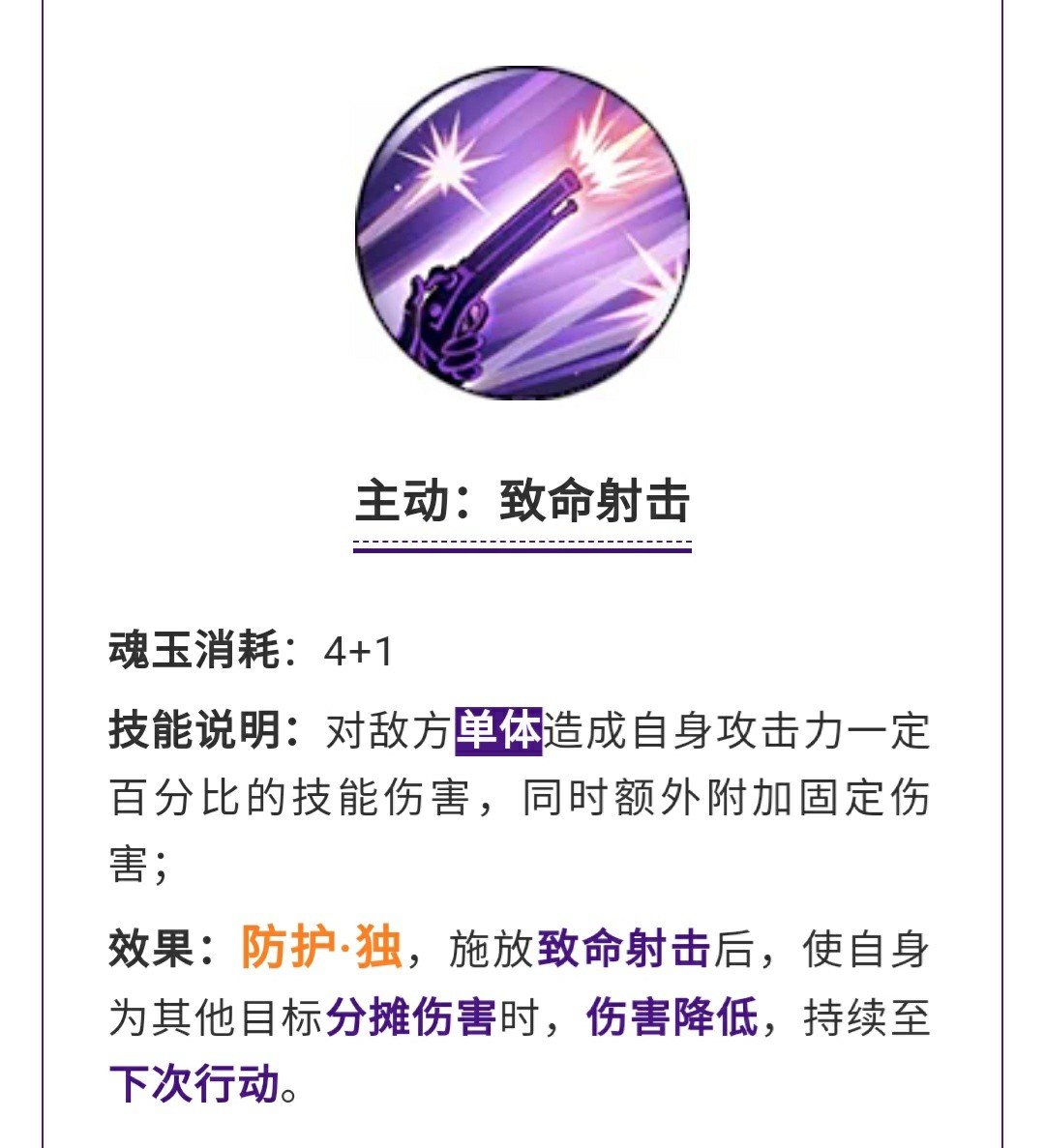 主动技能·致命射击这是一个分担伤害的技能,并且伤害降低,目前看来没啥用,因为黑胡子技能格子就那么多,这个技能并没有起到什么决定性作用。
