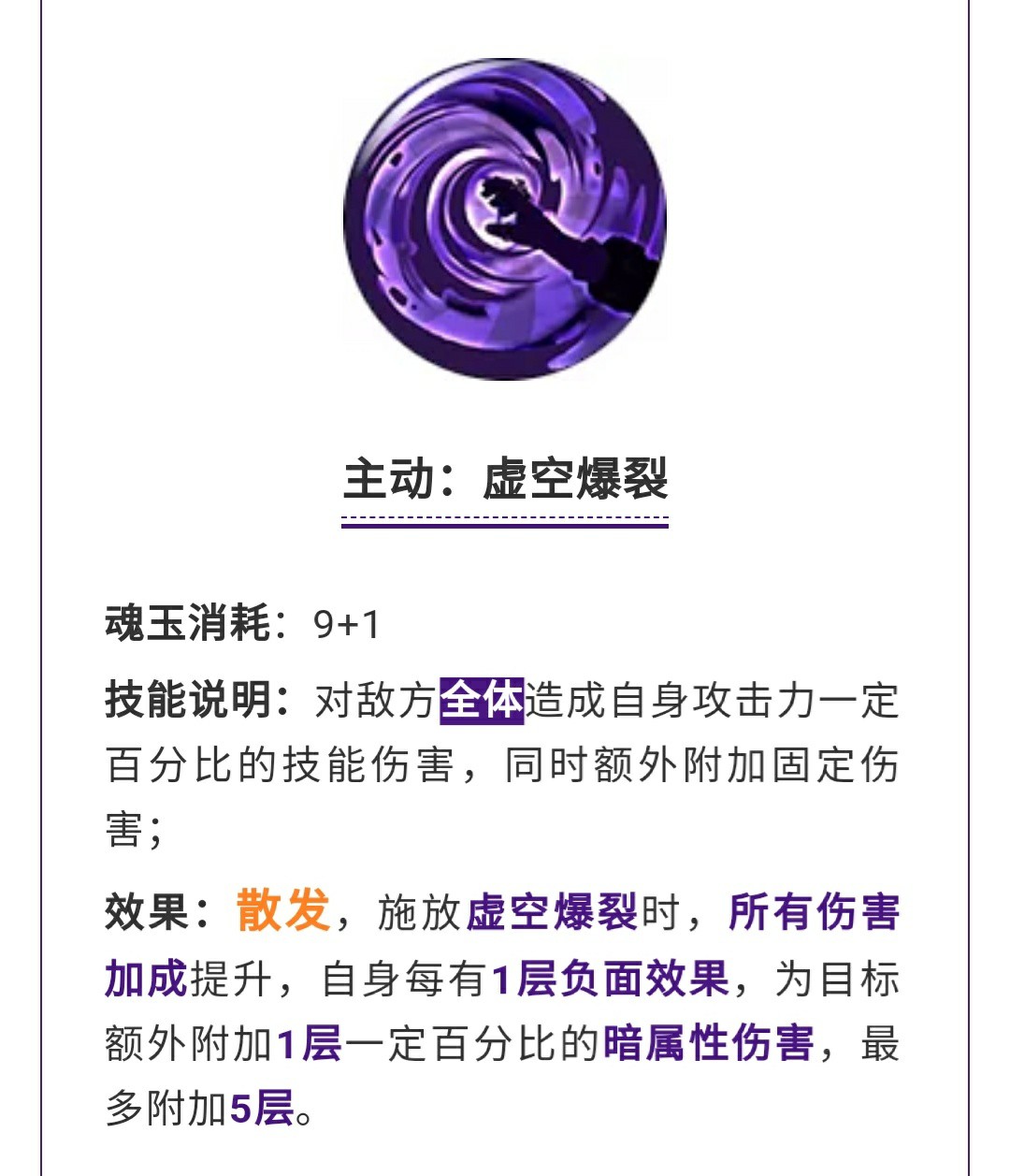 主动技能·虚空爆裂这是一个全体的10魂主动技能,目前整个游戏里面10魂的AOE全体技能还是相对比较少的,附加状态加伤害,而且身上有一层负面属伤就增加一层。