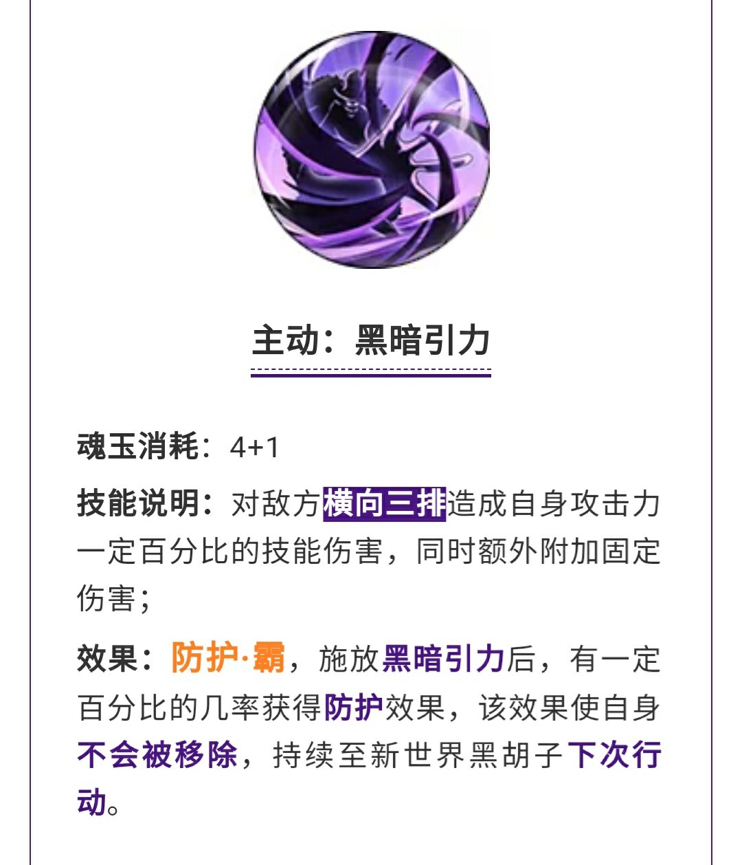 主动技能·黑暗引力这是一个非常牛掰的主动技能,老王认为这个技能是必带的了,5魂横向三排造成伤害,同时可以让自身不被移除,而且是持续到下次行动,也就是说只要技能丢出来了就不会被移除了(明着说白胡子弟弟你不行的)
