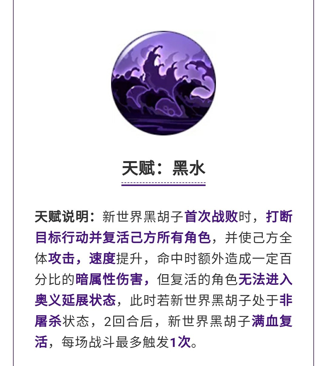 天赋·黑水这是一个团队天赋,黑胡子战败的时候复活全体队友,同时加速度加攻击,还能加暗属性伤害,但是复活的队友没办法进入奥义延展,同时如果黑胡子在非屠杀状态时死亡,2回合后还能满血复活。
