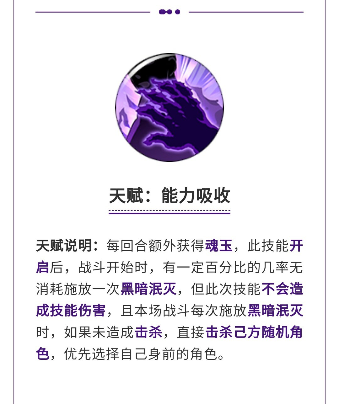 天赋·能力吸收每回合获得魂玉,同时这是又是一个可以开关的天赋(类似卡普),如果开启在战斗开始会丢出一次黑暗泯灭,但是没有伤害,而且如果后续这个技能不能直接击杀敌方人物就会直接带走一个队友,这个狠啊!而且是优先身前的这一波背刺牛掰!