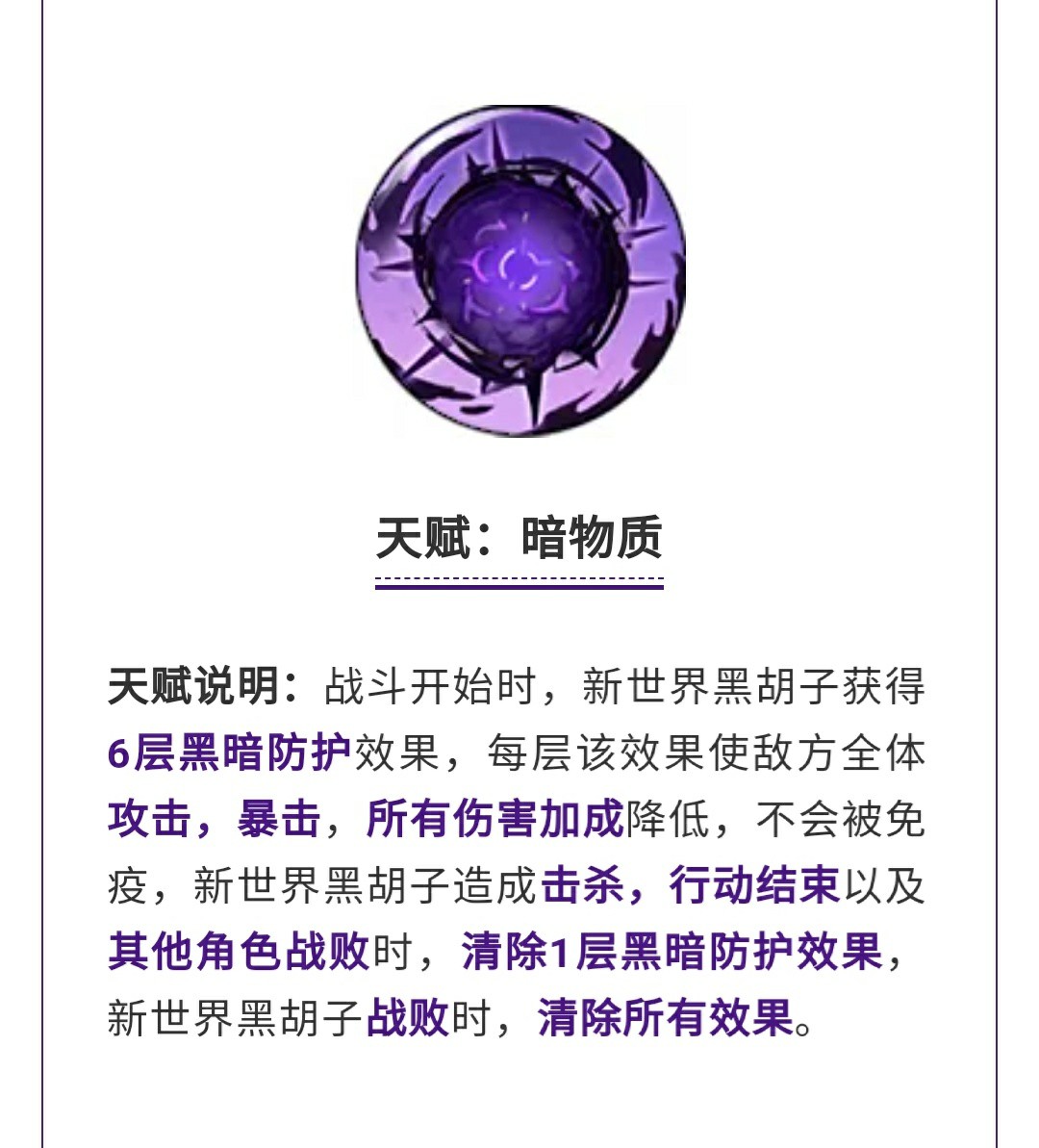天赋·暗物质这也是一个黑胡子的团队天赋,开局直接获得6层黑暗防护,让对方的攻击、暴击、所有伤害加成全都降低,同时没办法被免疫,黑胡子击杀或者行动结束时会掉一层。