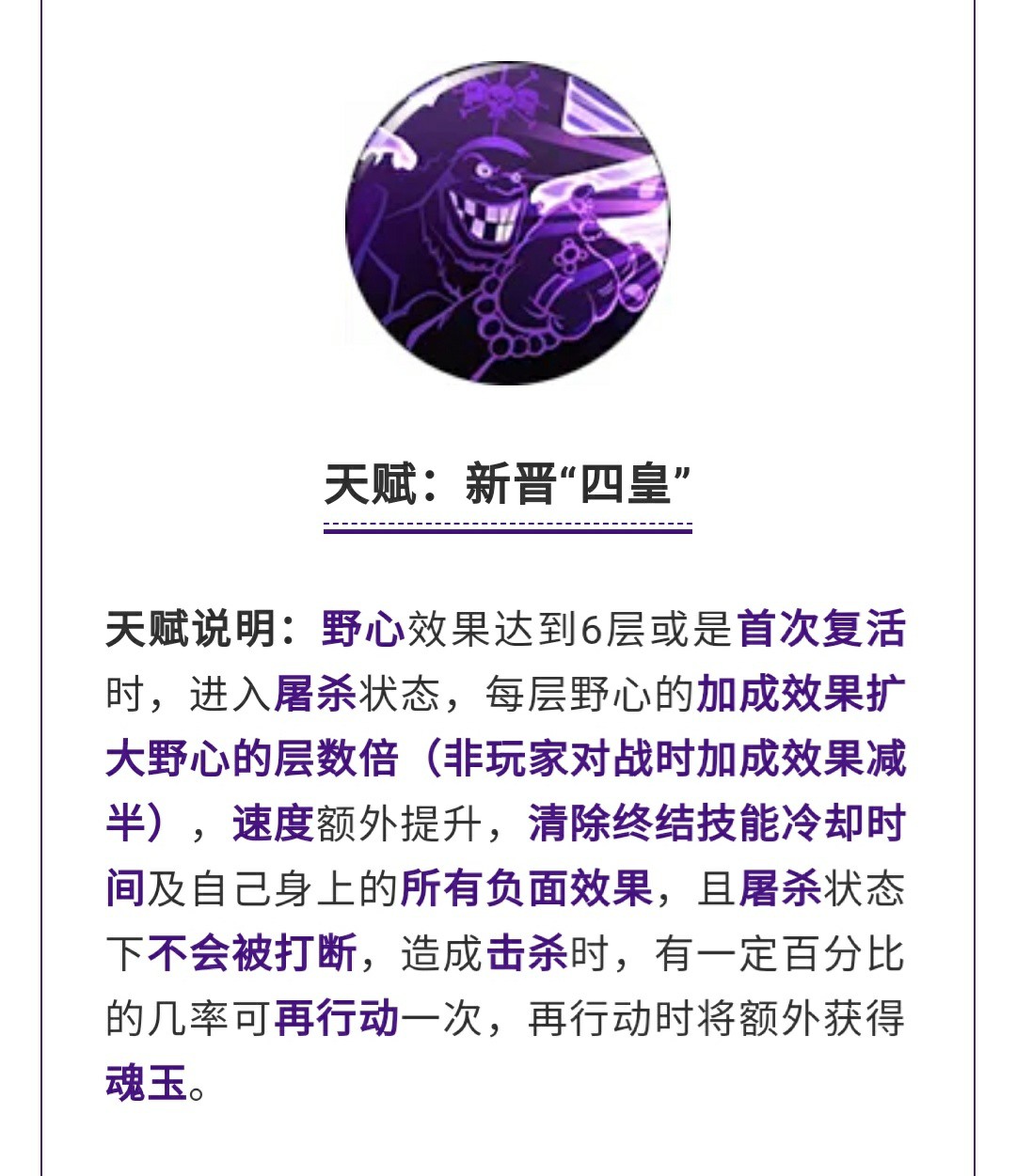 天赋·新晋“四皇”这个天赋也是跟上面环环相扣的,清除了6层黑暗防护也就相当于是达到了6层的野心了,黑胡子也就进入屠杀了,屠杀状态下速度提升,终结冷却和负面清除,并且不会被打断,同时造成击杀的时候还有可能再获得一次出手。