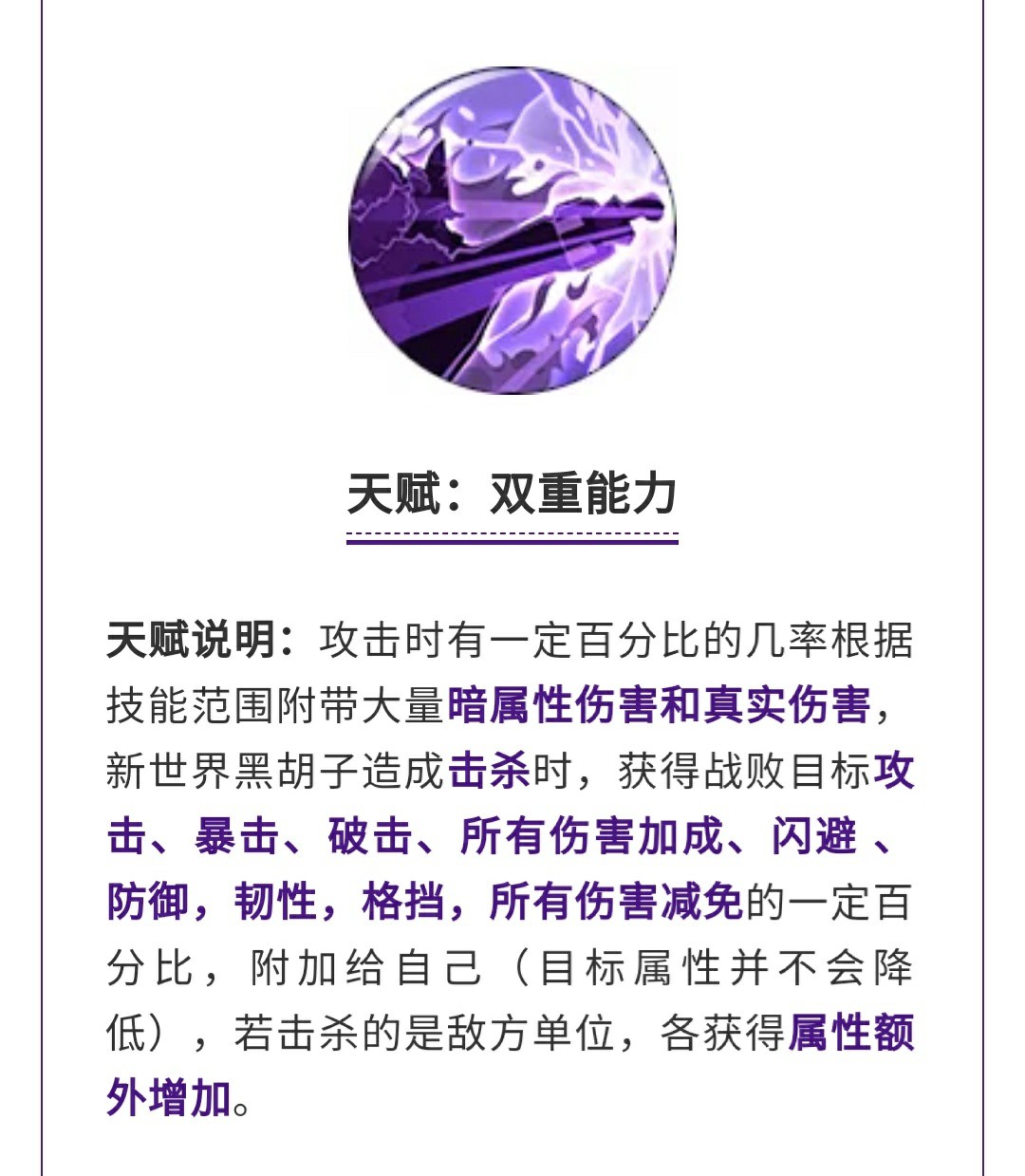 天赋·双重能力这个天赋是改过了,不过就改了一个命中而已,老王确实看不出目的是啥,是为了暗示后面的闪避流吗?这个技能简单来说就是杀人吸属性而已,符合动漫中的原版人物设定,这个技能出的非常好,点赞!