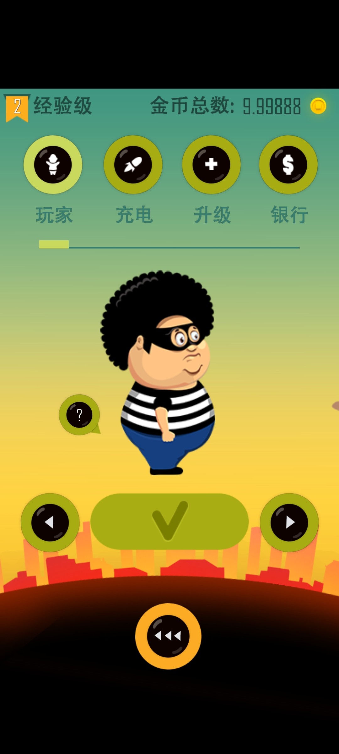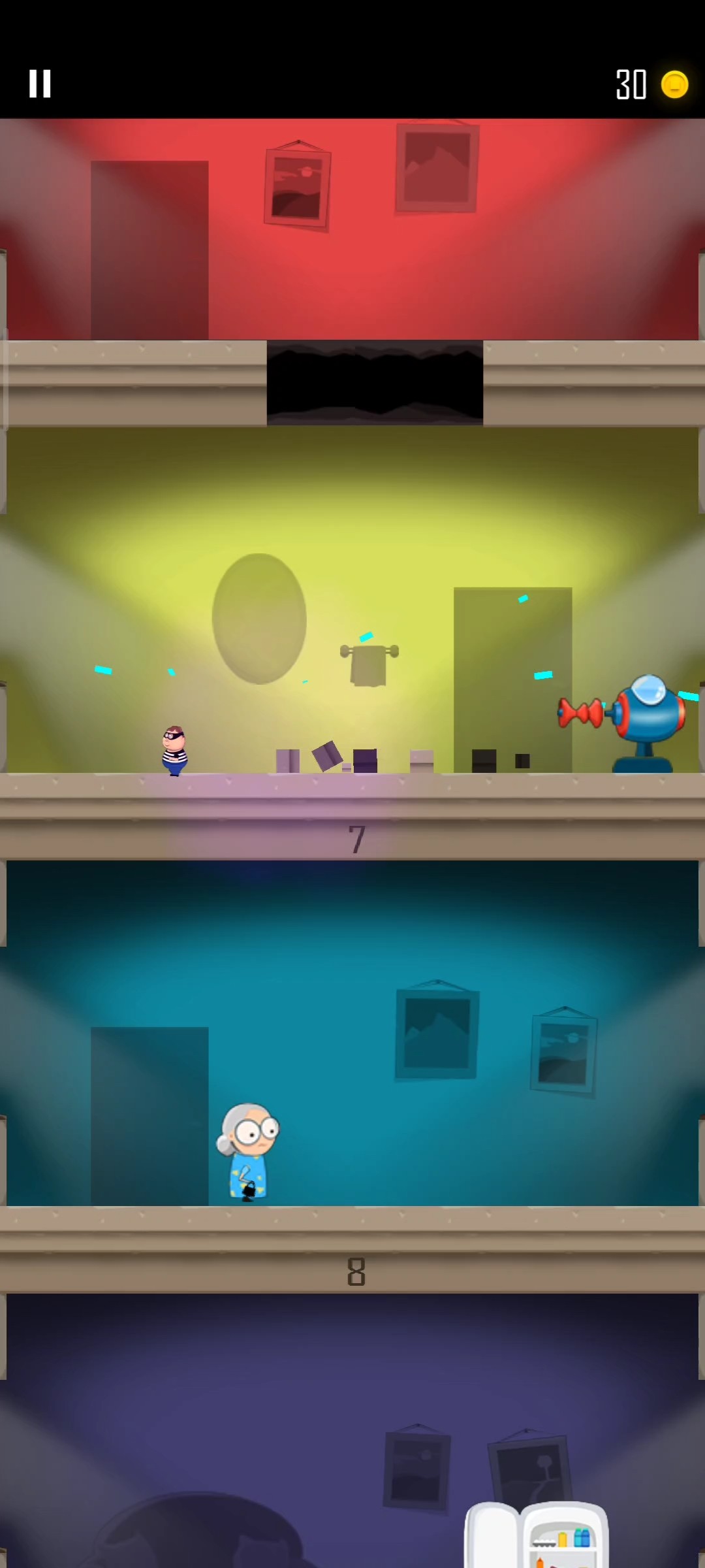 玩家需要操控小偷从第一层楼一层一层往下破坏偷金币,途中会有导弹,变小激光,警察等阻拦,但是各楼层中也会有各种不同的道具会帮助玩家突破更高的楼层获取更多的金币。