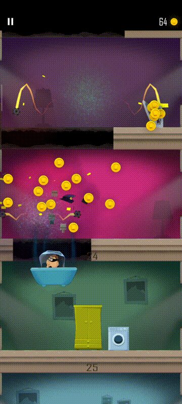 4.当楼层之间连续都有金币时可以选好起跳落地位置,确保破坏地面的同时也能吃到全部金币,可以解锁精彩跳跃的称呼,可用于完成任务;如果落地的同时击杀警察到了下一层也顺便击杀警察可以继续破坏地板获得超级破坏称号。