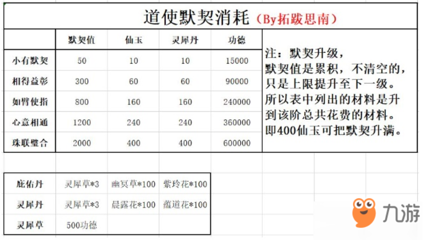 默契的升级材料主要有两种:灵犀丹与血契状。灵犀丹需要炼制获得,炼制一颗需要三株灵犀草,一颗灵犀草500功德购买