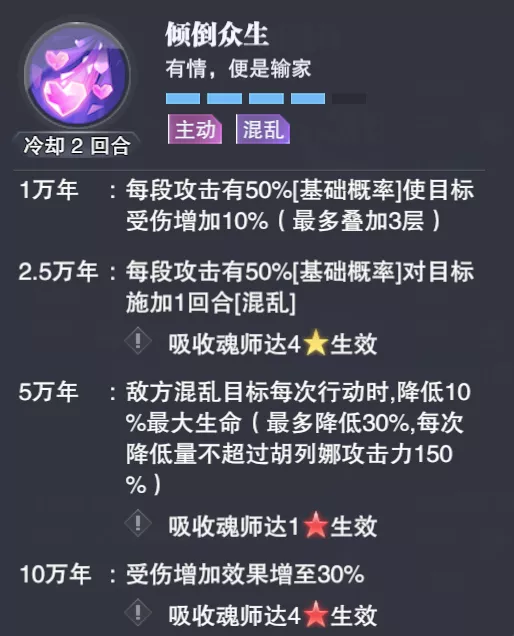 这里又例如增伤魂师里的胡列娜,4-1技能【倾倒众生】的10万年效果为单层受伤效果提升至30%,3层则为90%的永久增伤,这对基础只有10%每层增伤,3层最高30%的原技能效果而言简直就是质变,靠着2技能的被动【混乱】or【重伤】增伤,如果有10万年的蟒蛇系魂环,胡列娜其实就是目前游戏中最强的增伤魂师之一。