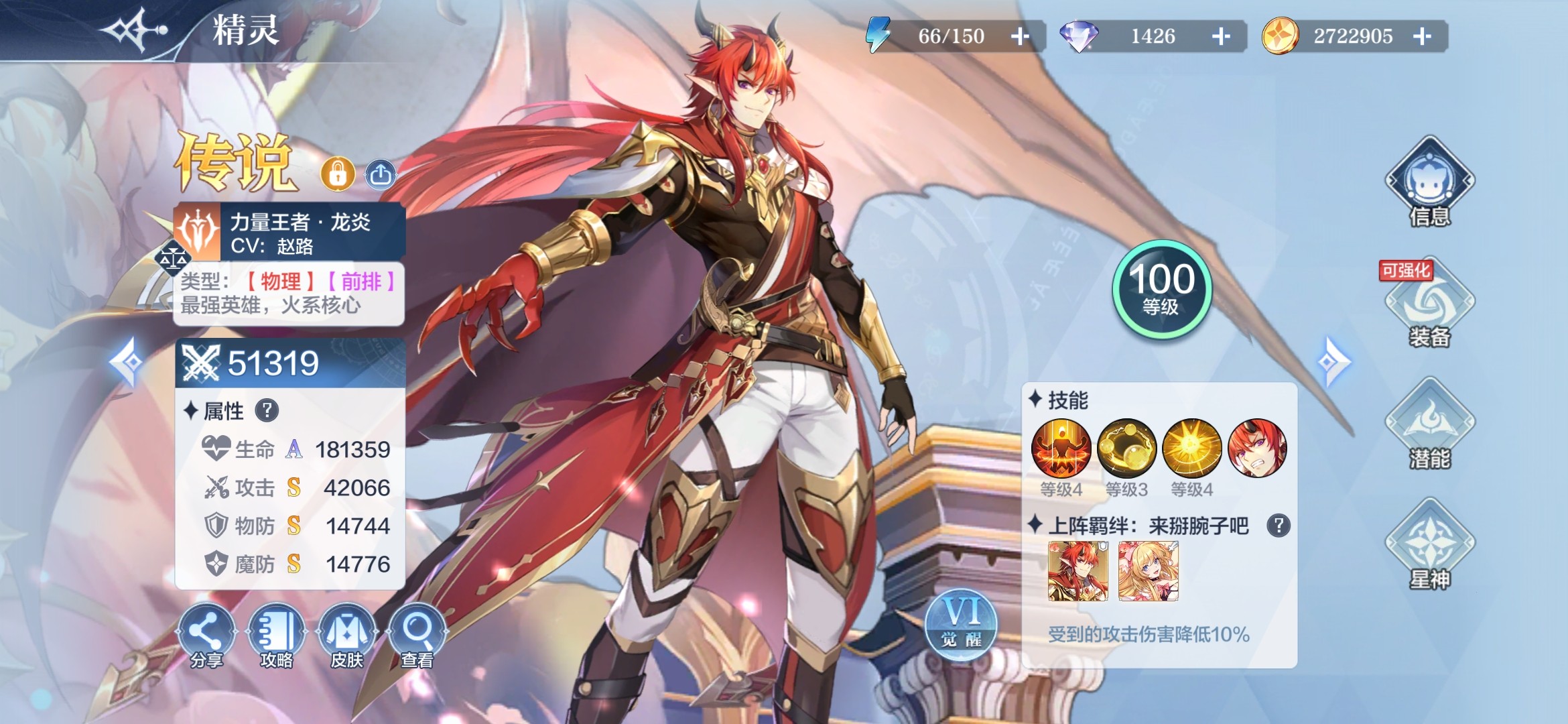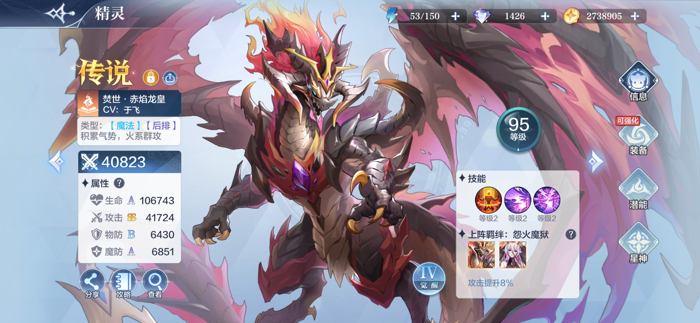 能和龙皇组上阵羁绊,攻击提升8%,受伤降低10%,是队伍中的辅助肉盾,其被动十分适合纯火的队伍,火系每增加一名,降低6%伤害最高24%这个可以随被动增加而增加,但最多还是吃四个火系,差一个系可以考虑上其他精灵,比如次元龙。