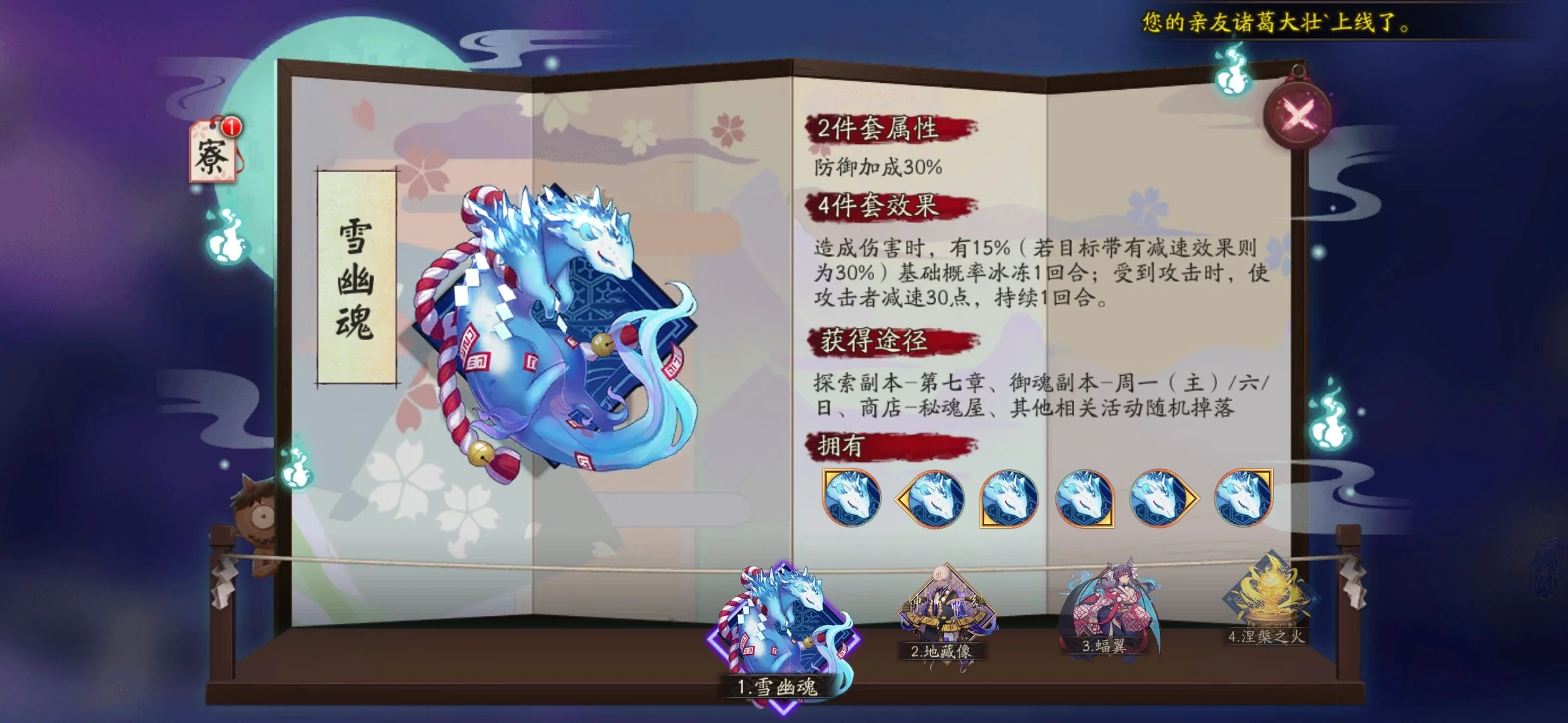 4件套——造成伤害时,有15%基础概率冰冻一回合,攻击减速效果增加到30%佩戴该御魂的受击减速对方30点速度。
