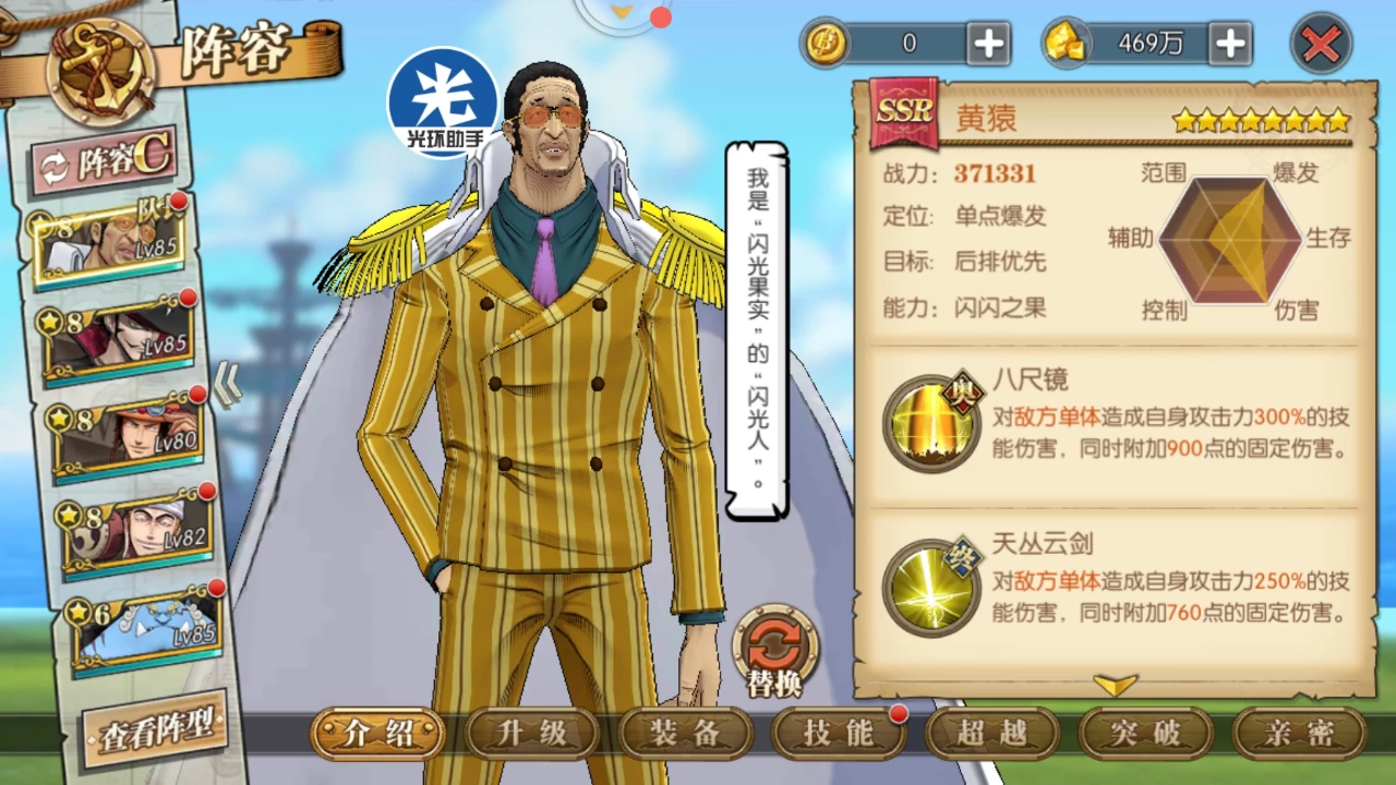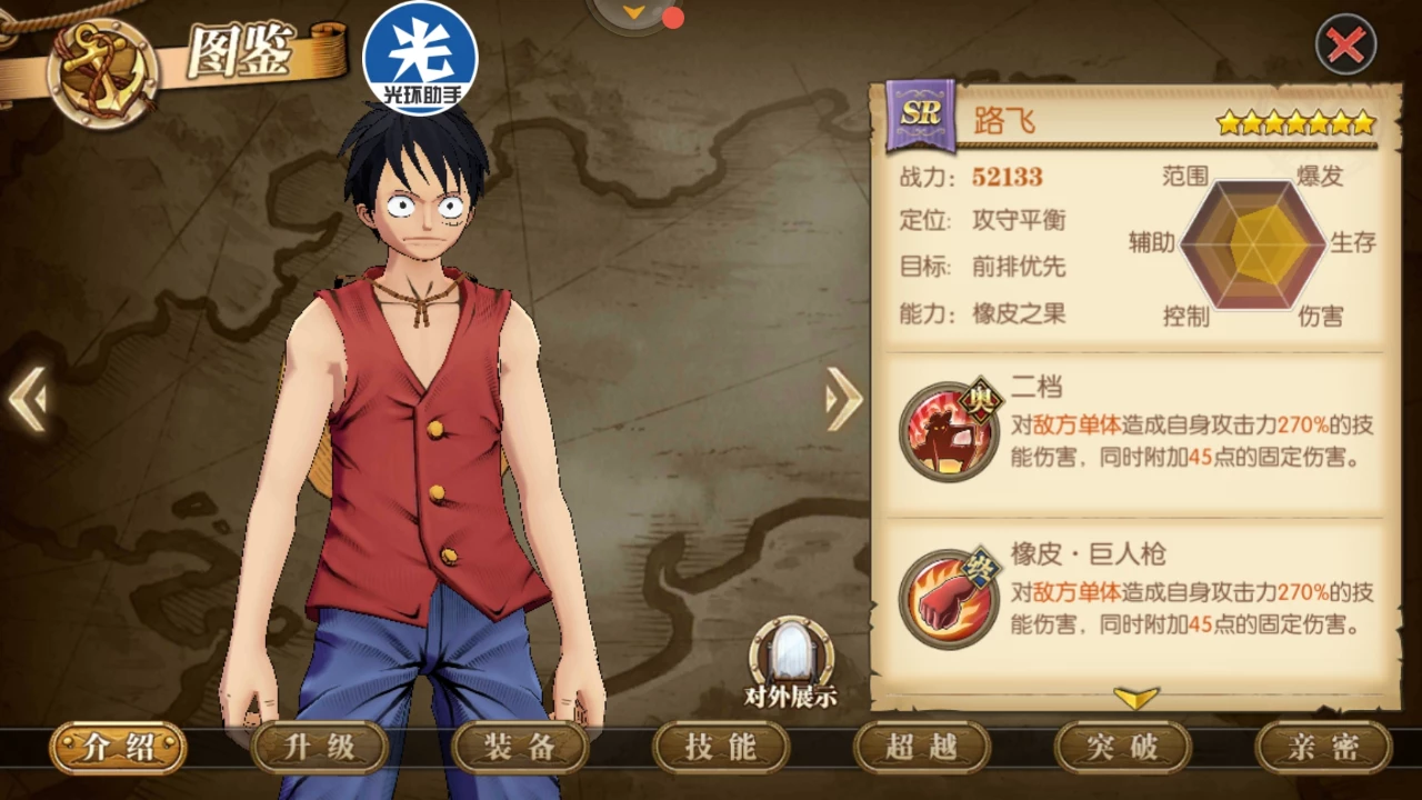 1.路飞:被雷利训练,修炼霸气,击败动物岛巨兽,最后挑战雷利,成功后晋级SSR卡,角色形象可以设置通关奖励皮肤代替,技能开启四档,奥义五档,开启天赋霸气