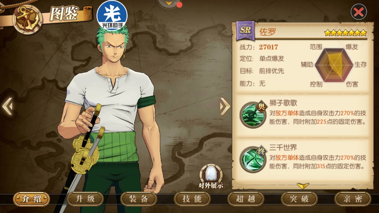 2.索隆:拜鹰眼为师,修炼剑气和霸气,击败神秘海盗模仿猴子,挑战鹰眼,成功后晋级SSR卡,角色形象可以设置通关奖励皮肤代替,技能开启鬼彻,奥义鬼眼,开启天赋霸气