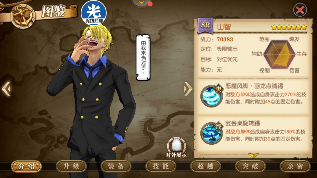 3.山治:进入人妖岛,通关人妖的试炼,挑战人妖王,成功后晋级SSR卡,角色形象可以设置通关奖励皮肤代替,技能开启月步,奥义黑足,开启天赋霸气(增强自己)或者美食*(辅助增益)