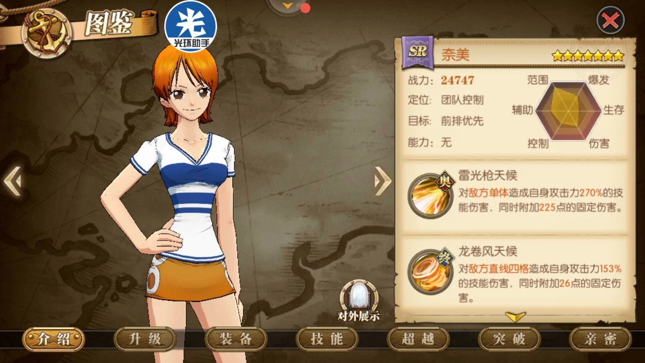 4.娜美:进入空岛天候实验室,通关逃离实验室的试炼,挑战天候科学家,晋级SSR卡,角色形象可以设置通关奖励皮肤代替,技能开启天怒惊雷,奥义宙斯,开启天赋智慧