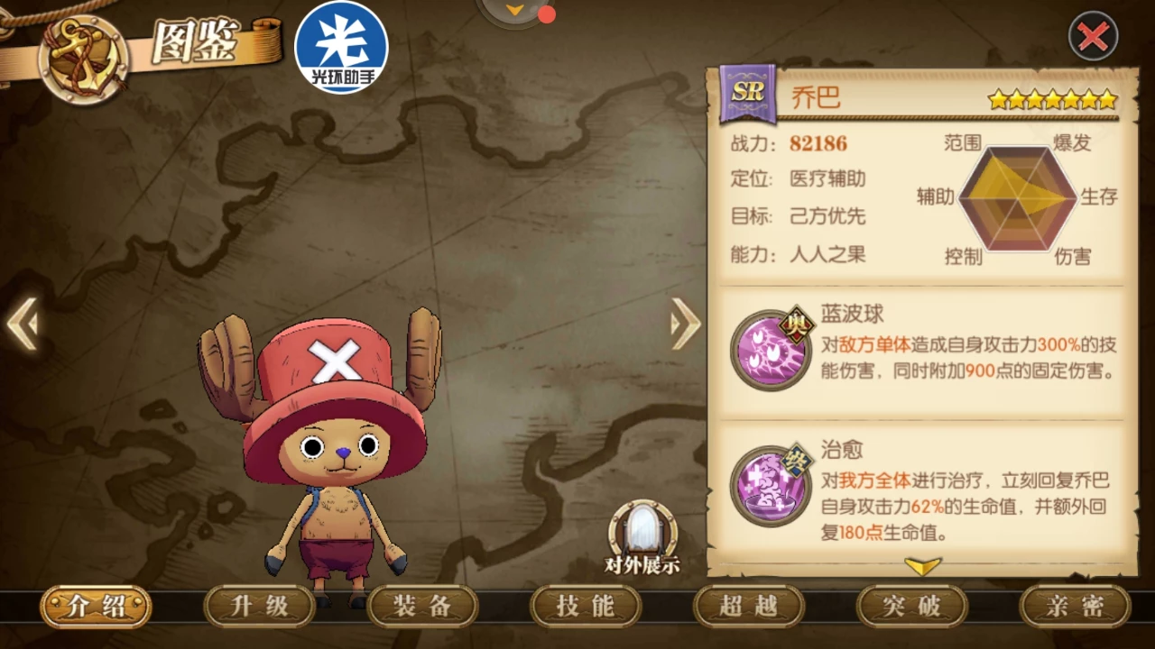 6.乔巴:进入巨树岛,通关野蛮人和巨鸟试炼,挑战巨鸟爸爸,晋级SSR卡,角色形象可以设置通关奖励皮肤代替,技能开启功夫乔巴,奥义进化蓝波球,开启天赋超级医师和暴力巨兽