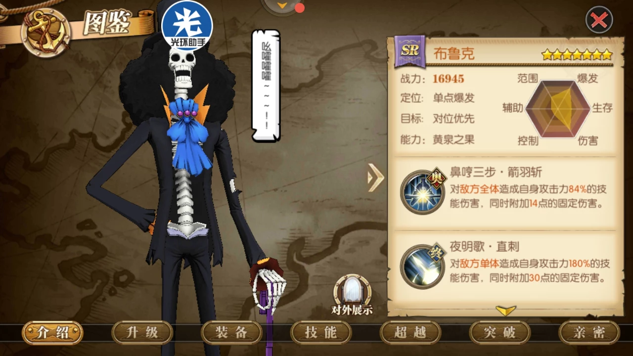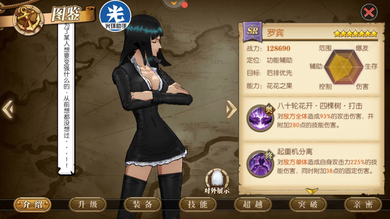 9.罗宾:进入革命军龙的船,通关革命军的试炼,挑战萨博和熊。晋级SSR卡,角色形象可以设置通关奖励皮肤代替,技能开始巨腿践踏,奥义花花果实,开启天赋防御加强和韧性加强
