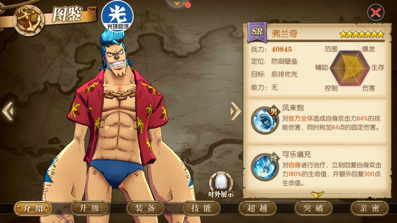 7.弗兰奇:进入科技岛,通关科技废物,挑战天才科学家遗留的战争机器,晋级SSR卡,角色形象可以设置通关奖励皮肤代替,技能开启钢铁之躯,奥义弗兰奇将军,开启天赋海战大师(海战增益)和科技之力(群体增益)