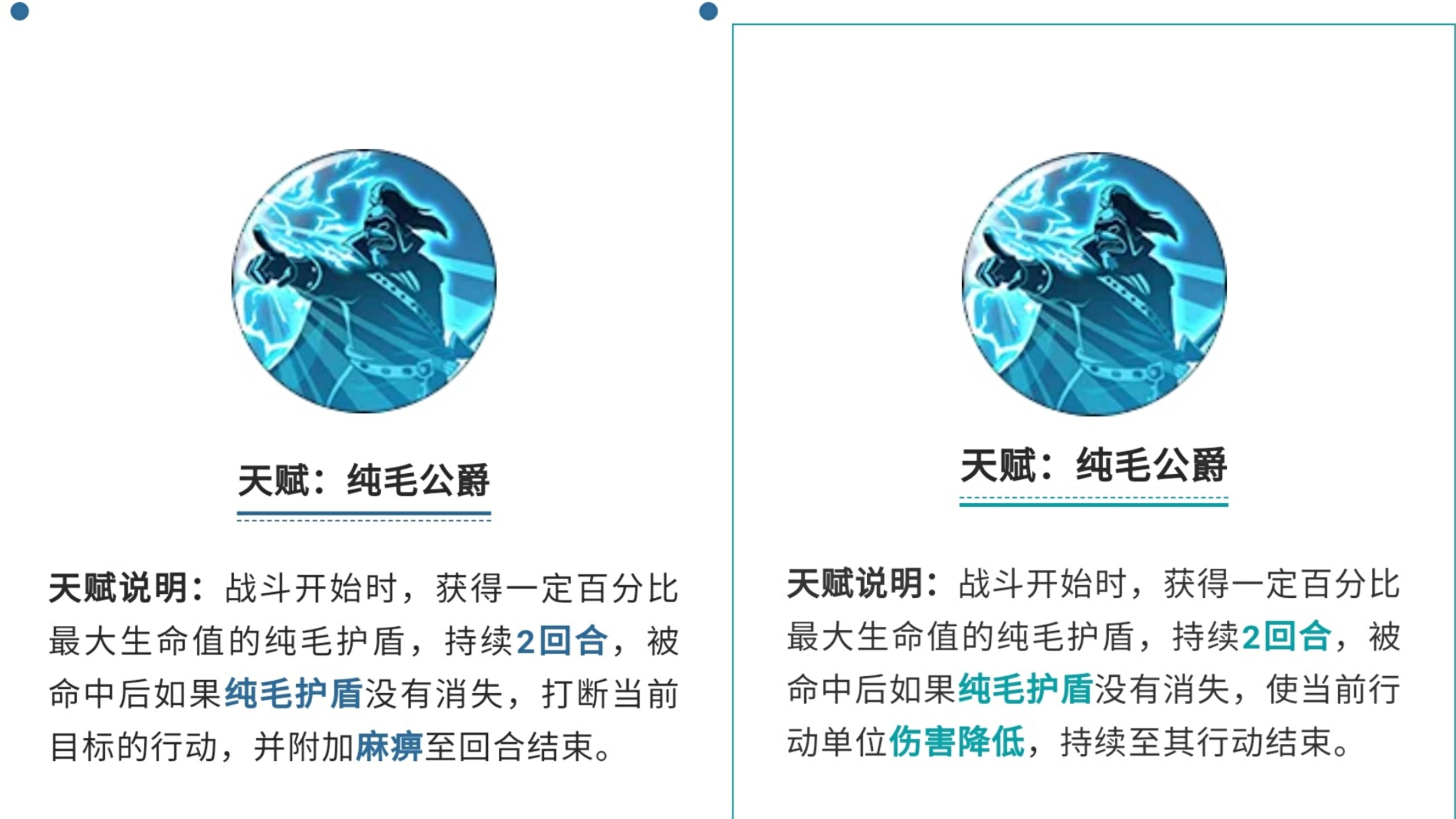 新区:血量最少2名角色获得1层毛皮防护,免疫下一次技能造成伤害,最多2层。