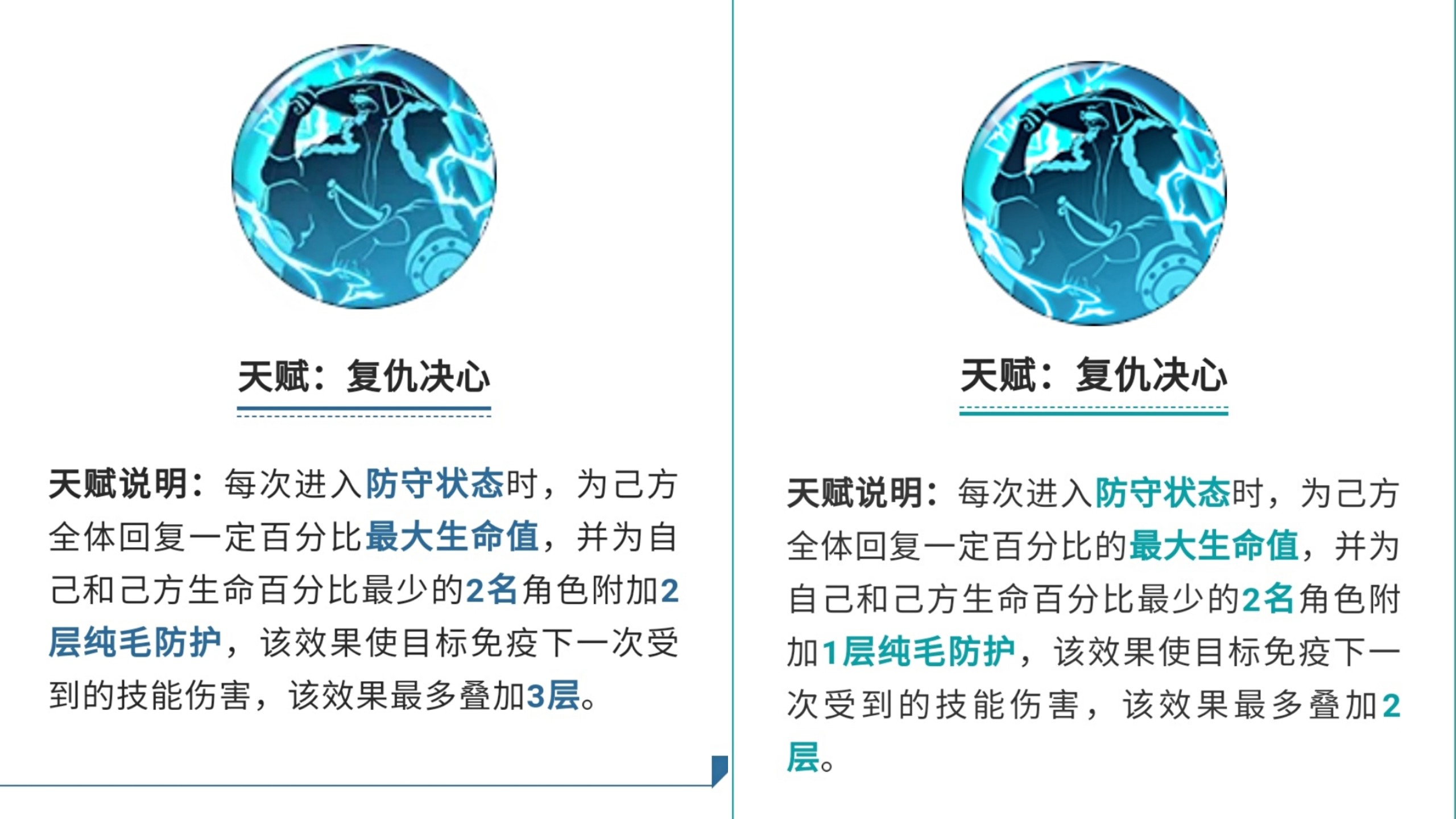 老区:血量最少2名角色获得2层毛皮防护,免疫下一次技能造成伤害,最多3层。