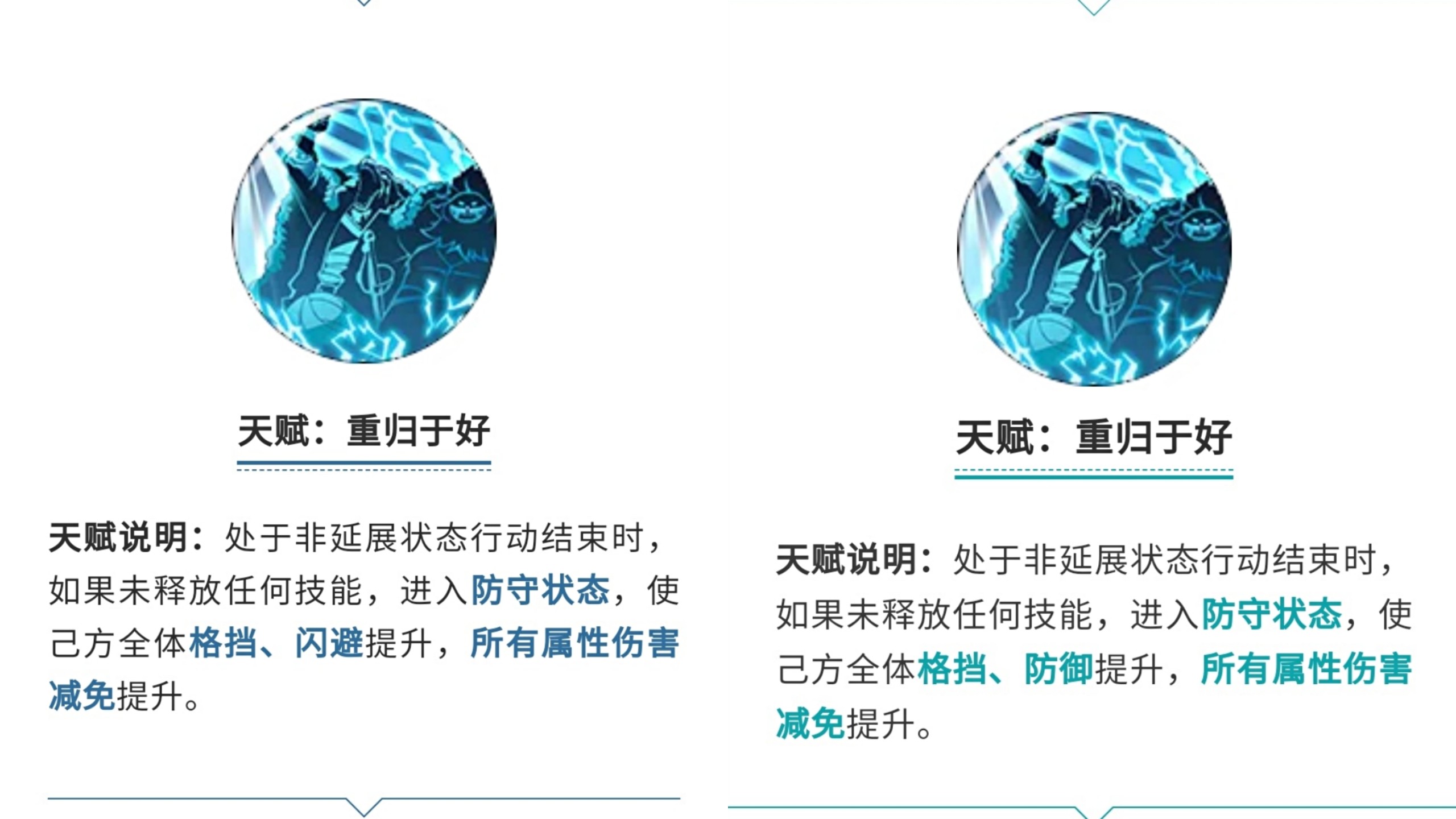 这个天赋其实就是有点像是巴托的屏障球了,就是抵挡住一次伤害而已,不过他这里可以叠加层数,也就是说这个防护如果跟狗狗的护盾叠加起来,那最少可以打断两个技能,因为技能都免疫了那肯定破不了盾了。这里需要注意的是只有进入防守才会有,所以只能奥义然后终结这样进行一个切换(致命有可能会继续香起来)