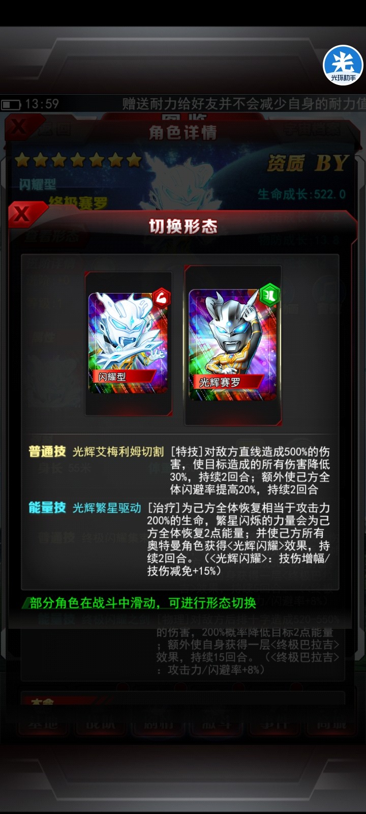 首先呢,光辉赛罗这只角色的能量技,技能效果很好,对乙方有治疗效果和非常强大的buff增益效果,很好的主推加血流。