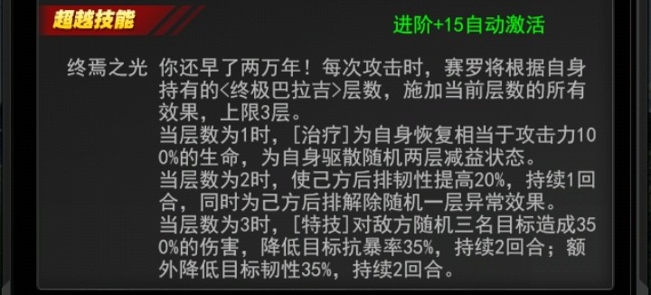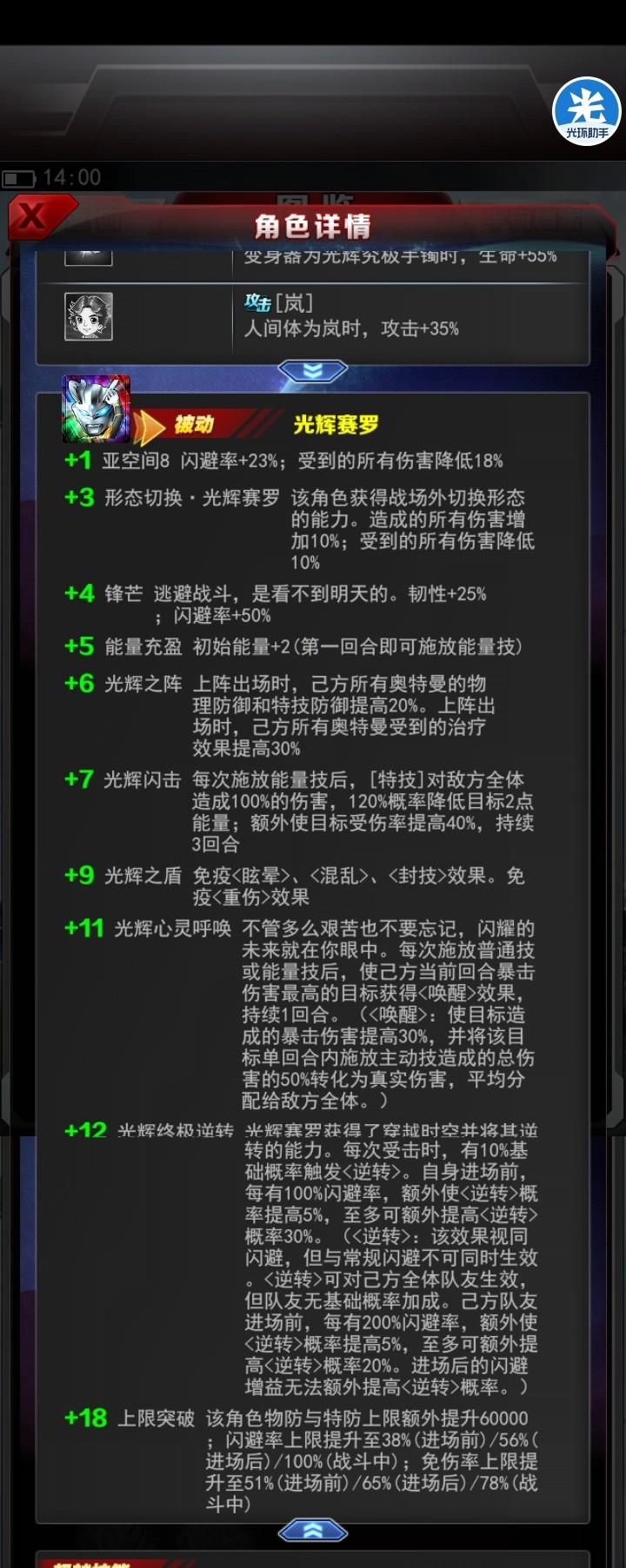 +7被动光辉闪击每次施放能量技后,[特技] 对敌方全体造成100%的伤害,大招施放过后,还有全体伤害,太强了,这个赛罗,120%概率降低目标2点能量;额外使目标受伤率提高40%,持续3回合