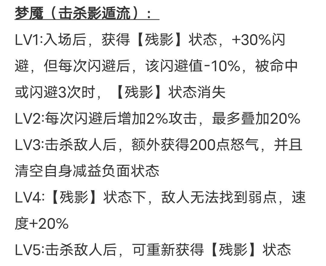 残影状态三回合闪避可以保证刺客英雄生存,保证其较佳生存能力拥有更佳的输出环境;四级后还可以提升20%速度,在目前增益削弱条件下,20%速度提升可以大概率使其率先出手,兼顾输出和生存