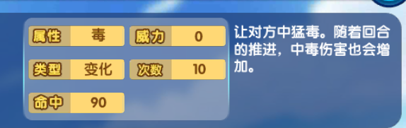 每回合损失1/16的血量,然后根据场上待的回合数,逐渐损失血量,也就是说,一个精灵陷入猛毒状态,在场上的回合越长,伤害就越高,下场之后重新上场,重新计算回合可以触发该状态的技能有:猛毒素、毒液牙、剧毒爆弹、超级溶解液,两层毒尖钉状态