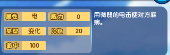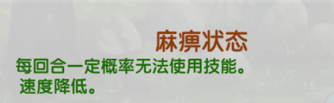 让精灵陷入麻痹状态,每一回合都有几率不能使用技能,但是这个几率无法计算,让精灵的速度降低为原来的1/4