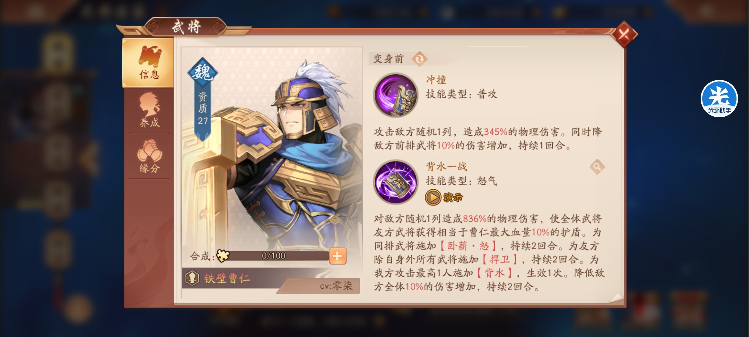 曹仁的技能是蓄力爆发,非常依赖队友,配合典韦的战阵也许有奇效。
