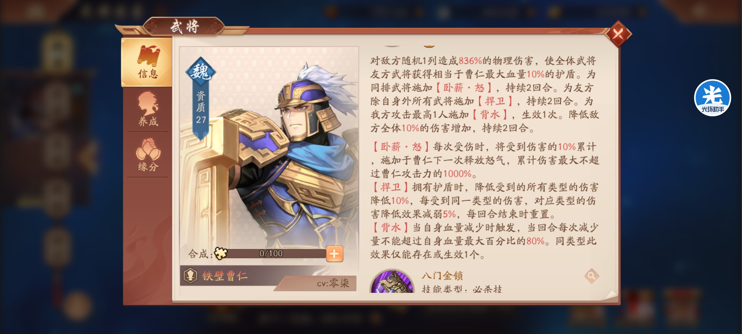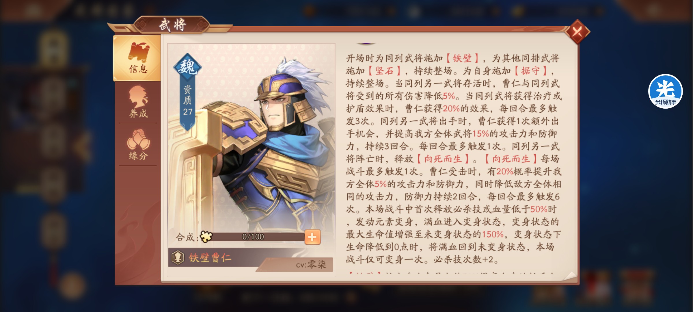 开场为同列附加铁壁,同排其他武将坚石,自身据守持续整场。同列武将存活时,曹仁和他所有受伤降低5%;他出手时,曹仁获得一次额外出手机会,并提高我方全体武将15%攻防3回合,每回合一次。他阵亡时,释放向死而生,每场触发一次。