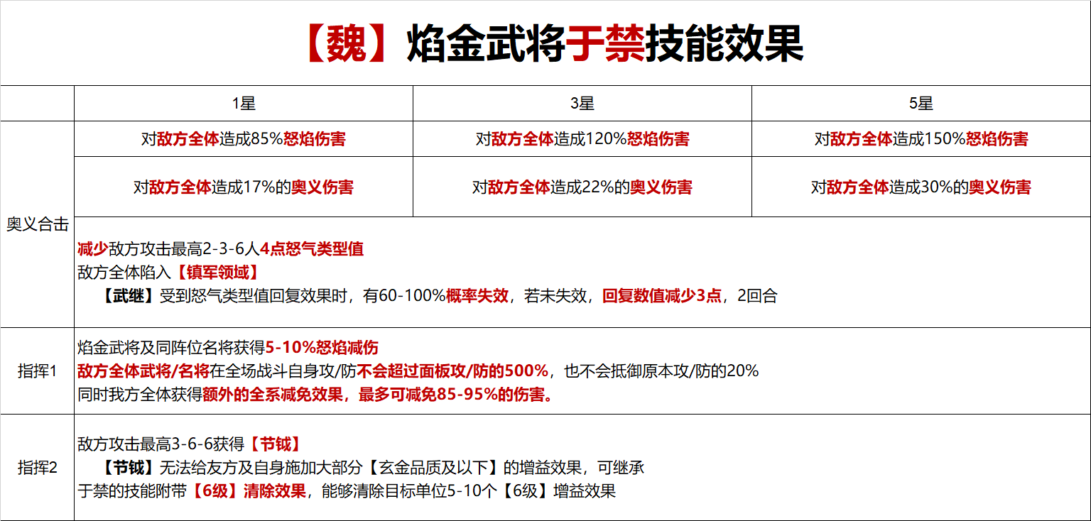 ①于禁减怒以及镇军领域回怒概率失效低星即可克制其他各国,使其没有足够怒焰只能进行普攻,同时于禁拥有不错的增益清除能力,限制增益叠加限制敌方输出能生存能力
