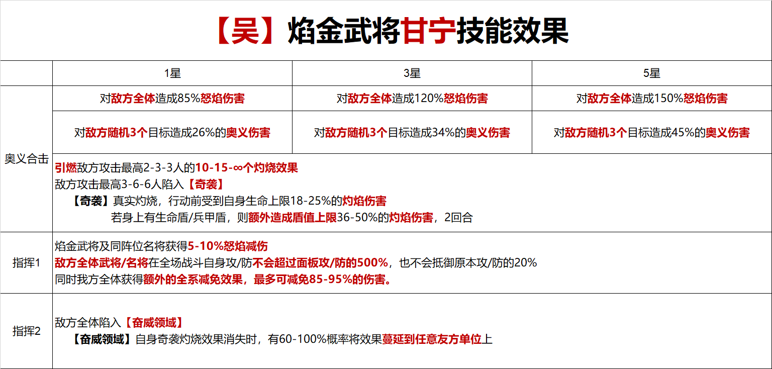③群雄和吴国技能和指挥效果重叠较高,甘宁蔓延效果仅能蔓延自身灼烧,公孙瓒指挥和技能全部专注于暴击率提升,无其他优异的机制,同时由于于禁的限制使其出手问题较大;虽然甘宁引燃+蔓延效果不差,但当前版本非但没有出专属名将,还有较多克制灼烧的技能机制导致吴国很难打出高爆发;公孙瓒暴击效果不差,但由于当前怒焰技能系数略低限制公孙瓒爆发(虽无视大部分减伤,但基础系数偏低同时焰金指挥的最高五倍面板攻击限制导致爆发能力有限)