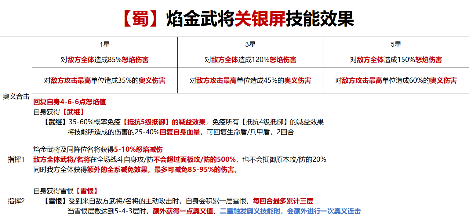 一星即有极强限制能力,目前由于怒焰回复机制有限,仅三星后关银屏有概率出手,强制使敌方武将普攻相当于软控制