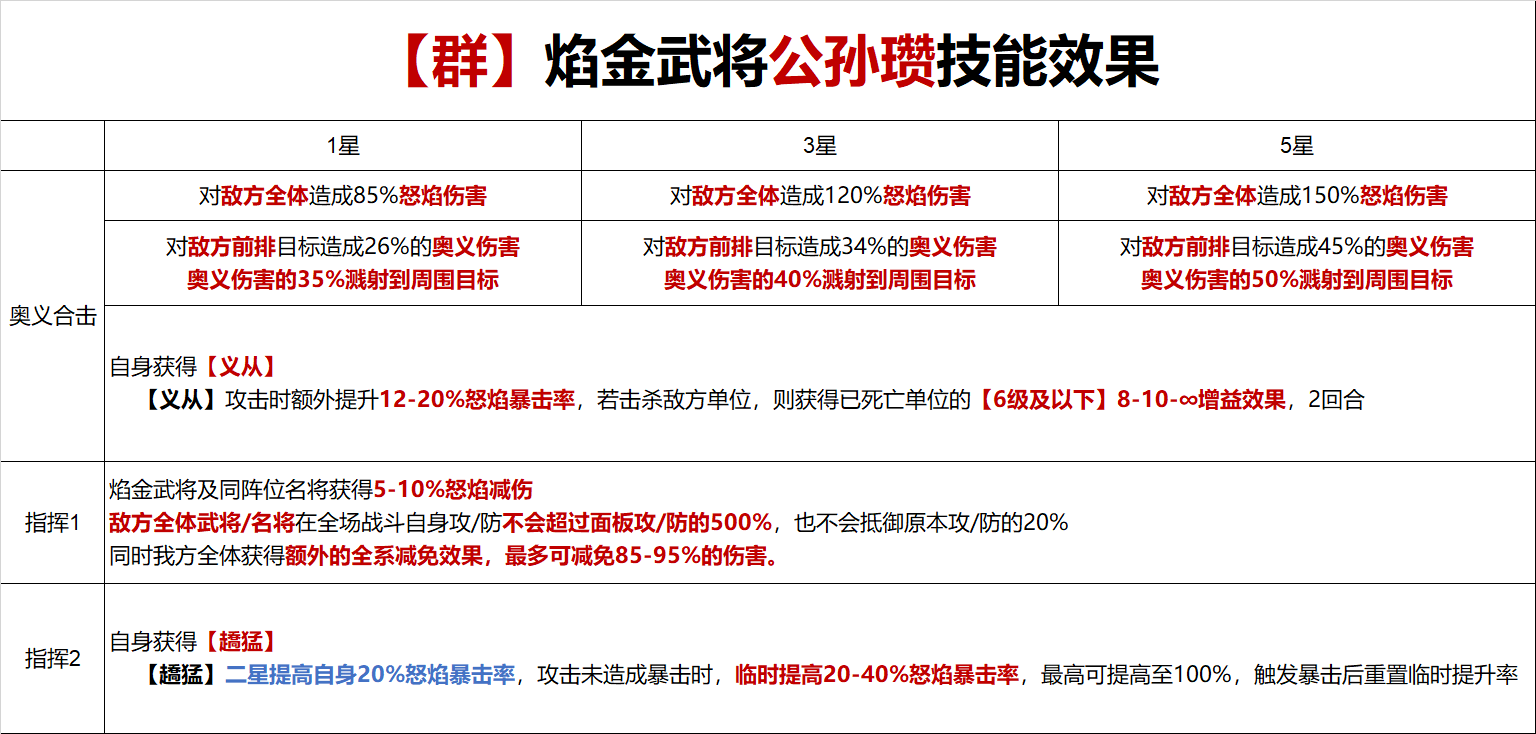 提高怒焰暴击率,保证自身爆发能力,但由于焰金武将基础数值并不算高,暴击伤害能力提升也有限