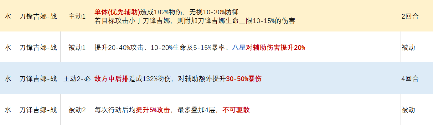 刀锋吉娜核心特色为切辅助,优先攻击辅助单位且对辅助单位拥有额外伤害加成和爆伤加成,作为神话卡牌功能型太过专一,不建议养成