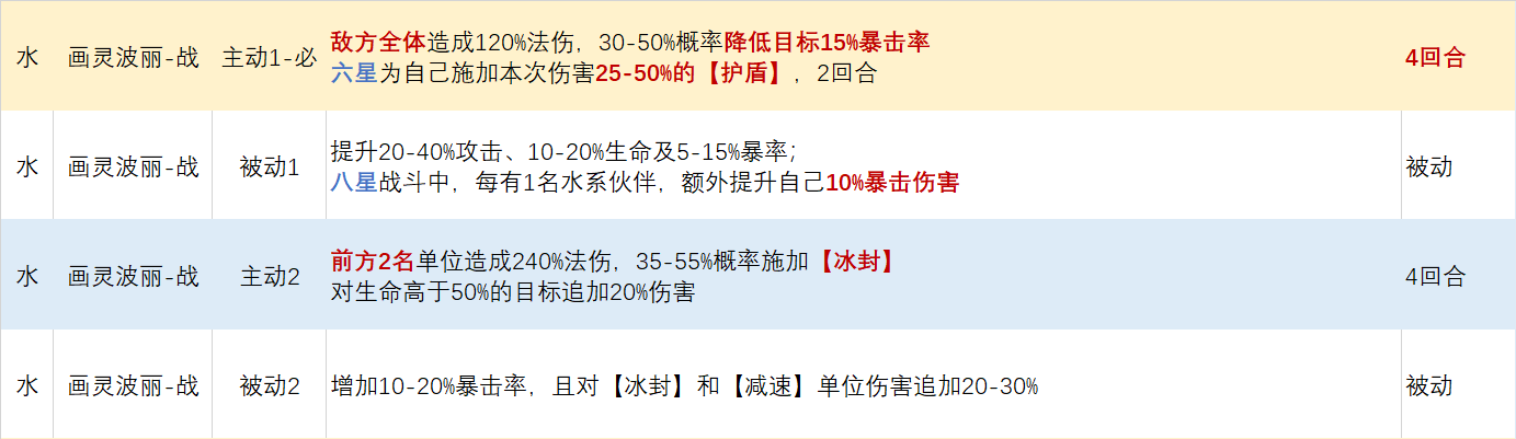 画灵波丽核心特色为降低敌方全体暴击率,前排概率冰封控制;但画灵技能真空期较长,依靠暴击打伤害,非暴击回血流的多保一体系不推荐培养