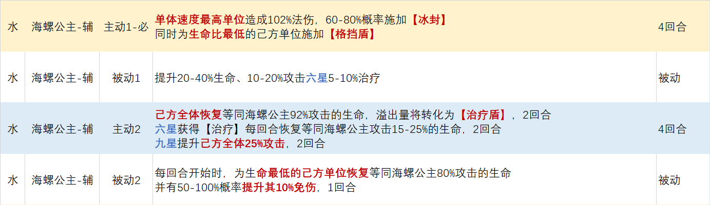 海螺公主核心特色为九星后全体攻击提升增益效果对于前中期越战推副本有一定效果;PK中高概率速度最高单位(技能冷却四回合略长)可以很好限制敌方主力输出同时拥有不错的全体恢复和持续恢复能力,但技能真空期略长,无驱散等清除机制,中后期较吃亏