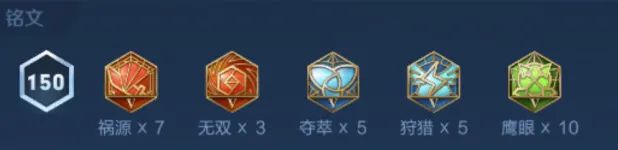 铭文红色7祸源+3无双,绿色10鹰眼,蓝色可根据个人喜好狩猎、夺萃55开,也可以全带夺萃,但不太推荐全带狩猎,前期没有续航还是很难受的。