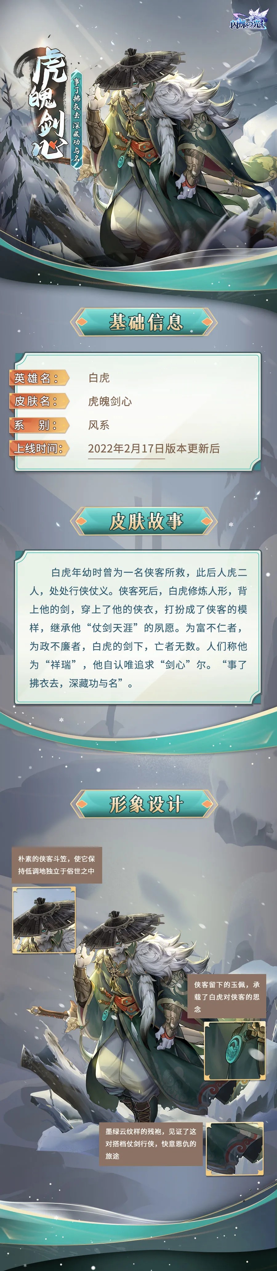 白虎新装「虎魄剑心」登场,侠气虎爪四方斩恶!灼热阳阳发布于 2022-02-15关注有人的地方,就有江湖。而江湖,自然存在着无数义胆豪情的侠客。过去的白虎,正是这样与一位侠客行走江湖,以身惩恶。人虎二人积累下了深厚的感情,因此,在侠客身故后,「白虎」披上了他的侠衣,坚定地继承了他的夙愿。 新年新装连连!乌列之后,另一名英雄「白虎」,也将在2月17号收获专属新装「虎魄剑心」!上线之前当然少不了闪妹我带来的皮肤故事与外观细节展示啦,让我们一睹为快! “头顶青箬笠,身披御风裳。”