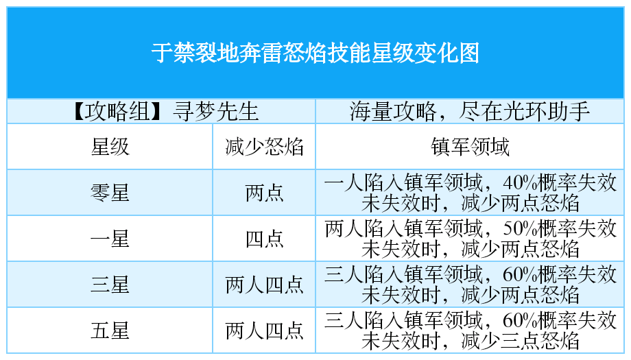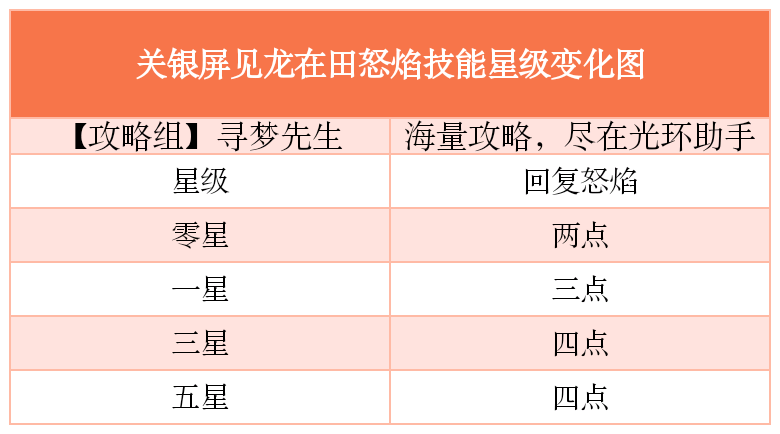 总结:焰金武将抛开伤害不谈,单从战略机制上讲,超合技能反而不如单体触发,也就是怒焰技能来的实在。因此于禁凭借减怒焰和镇军领域(限制回复怒焰)在低星阶段有着很大收益,可以说除了三星以上的关银屏,其他的武将只有普攻的份。那由于于禁门槛低但升星提升不大的情况,所以寻梦的推荐升星策略如下,仅供参考。