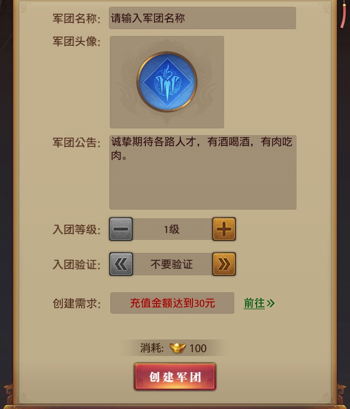 但是建立军团首要条件需要玩家进行{首次30元充值}之后才可建立军团。当然不自己建立也可以选择其他玩家建立的军团,多与其他玩家进行交流。
