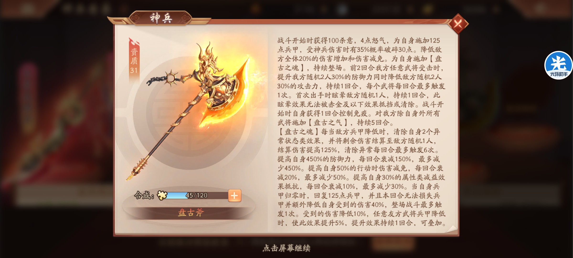 开局100杀意4怒,为自身加125点兵甲,受神兵伤害时概率破碎30点。降低敌全体20伤免,为自身加盘古之魂,持续整场。前2回合我方任意武将受击时,提高我方随机2人30%防御降低敌随即2人30%攻击一回合,每个武将每回合触发一次。