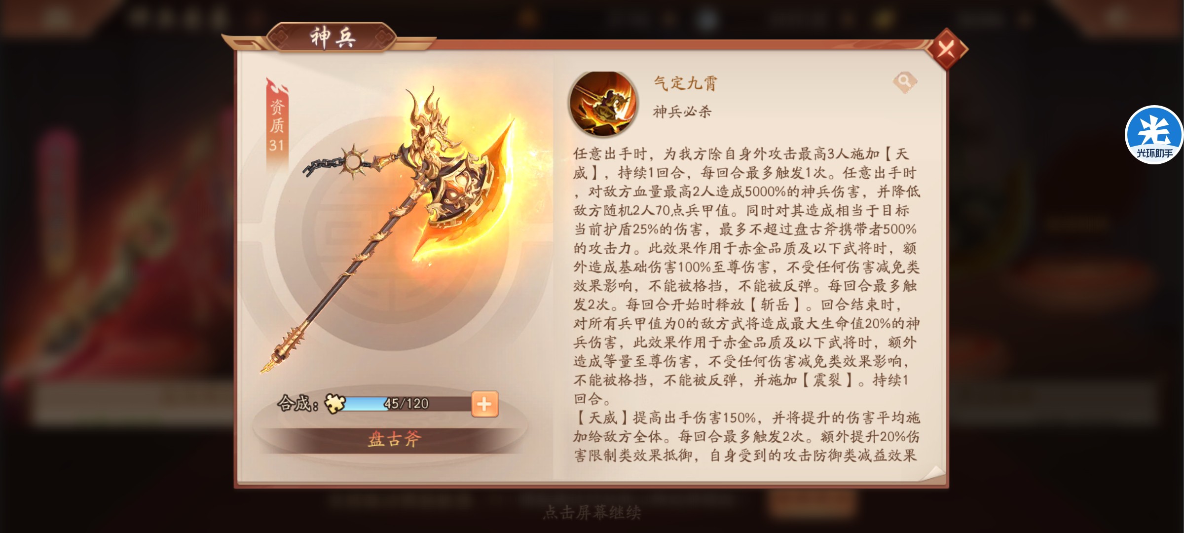 大家好,我是天池太子。新的赤金神兵盘古斧首发了,最近比较忙才看到。技能感觉没有很强,因为神兵伤害计算防御,可怕的是31资质、硬控和至尊伤害。憨憨文案又把技能位置写反了,我按顺序写。