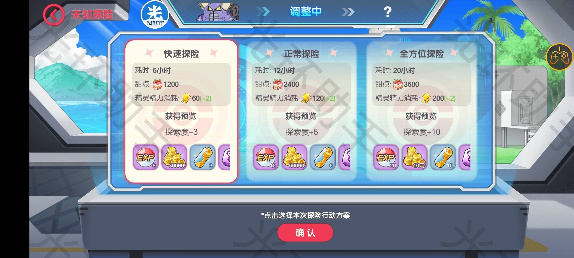 探险有四张图,类似钓鱼依次解锁,探险分为三种,快速、正常和全方位,所需时间依次提升,最高需要20小时,过程中需要五只精灵,且精灵体力需要足够。 我们平常游戏里的探险器可以在探险里提供技能例如降低甜品和精灵体力消耗…… 但是需要探险器15级以上才能在探险里解锁。