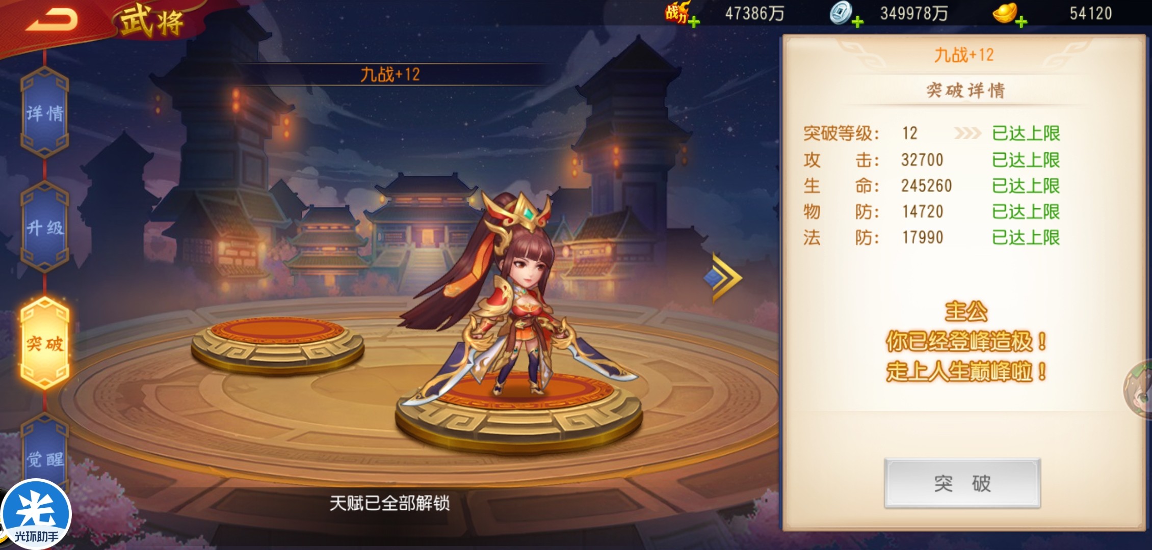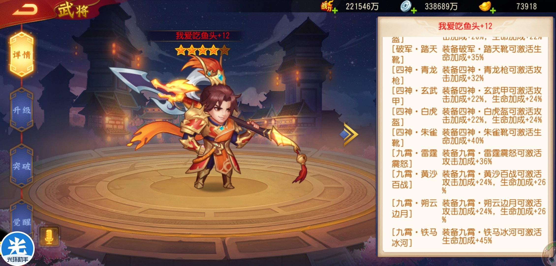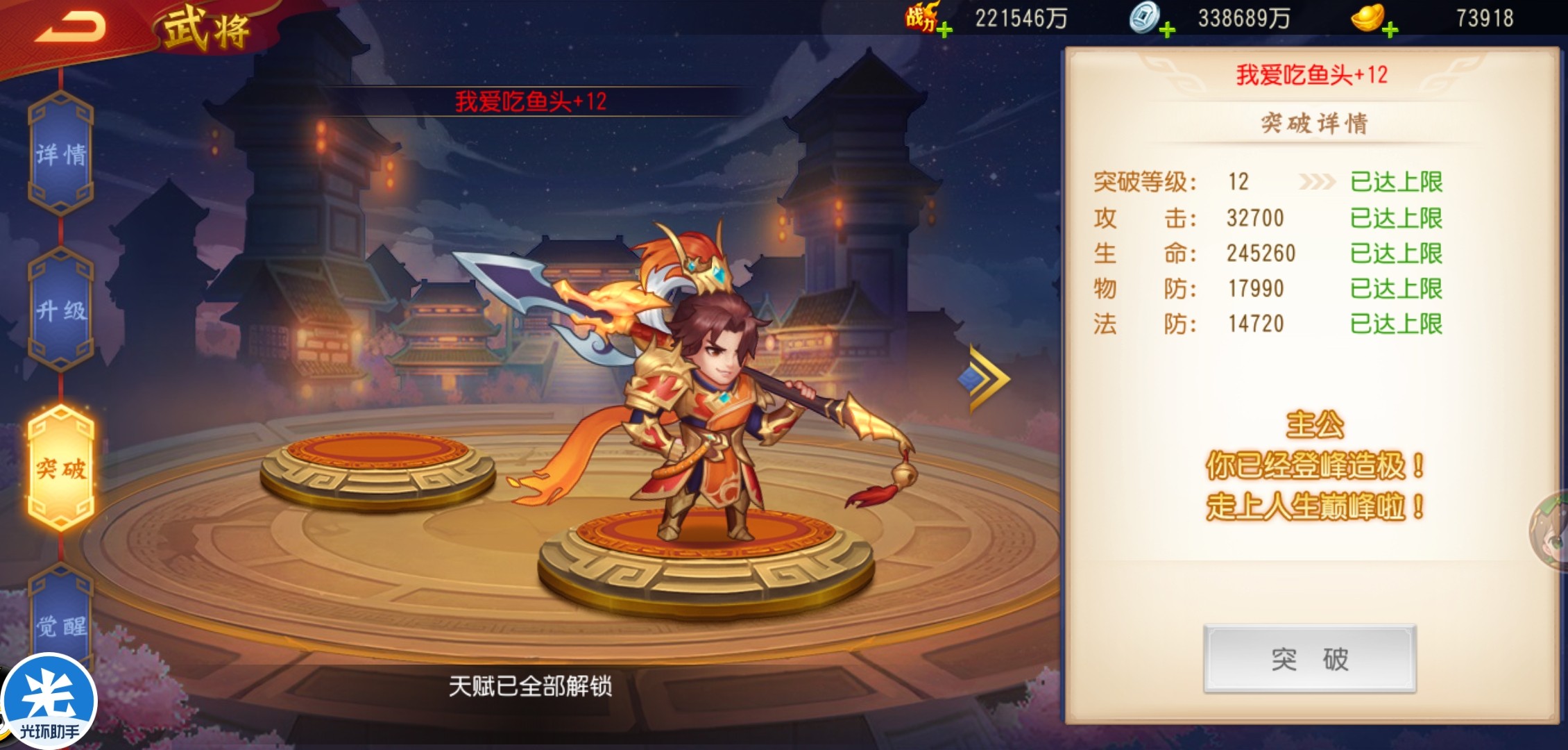 而上阵武将随着各种培养,比如界限,属性是可以进一步的提升。