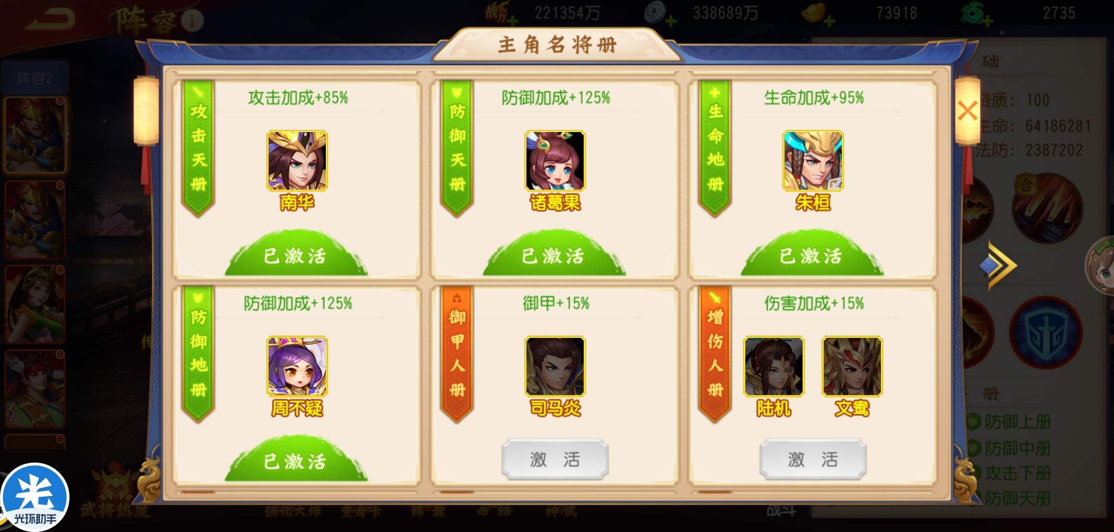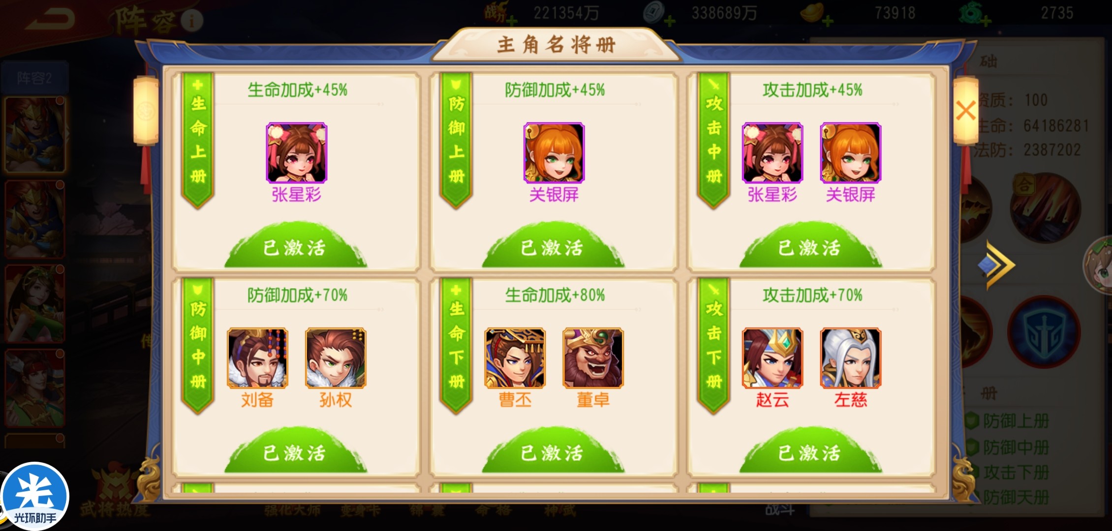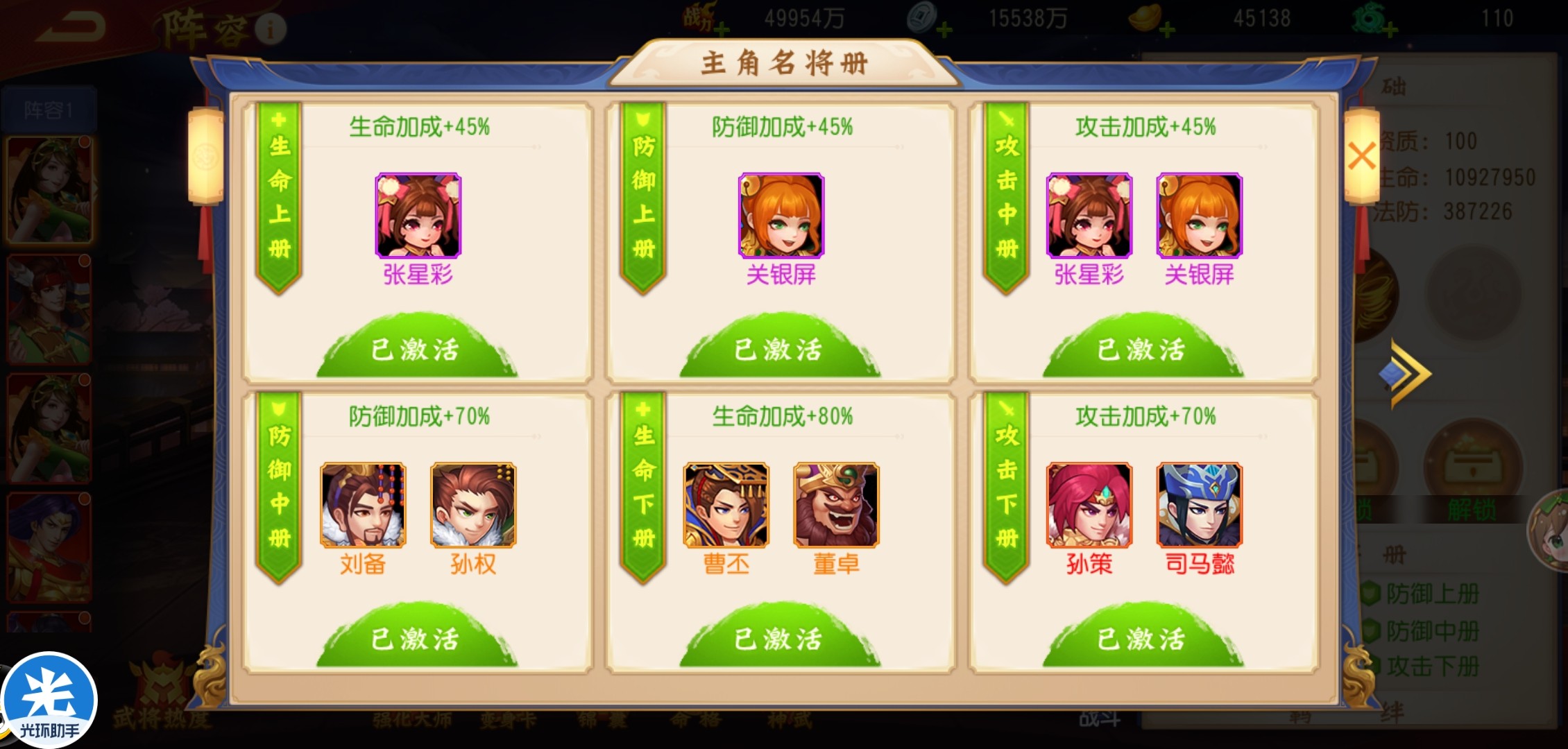 所以早期的时候,主角变身输出型武将的优势会高于上阵输出武将。不过这优势仅仅是在上阵武将未激活名将册之前的羁绊加成属性。