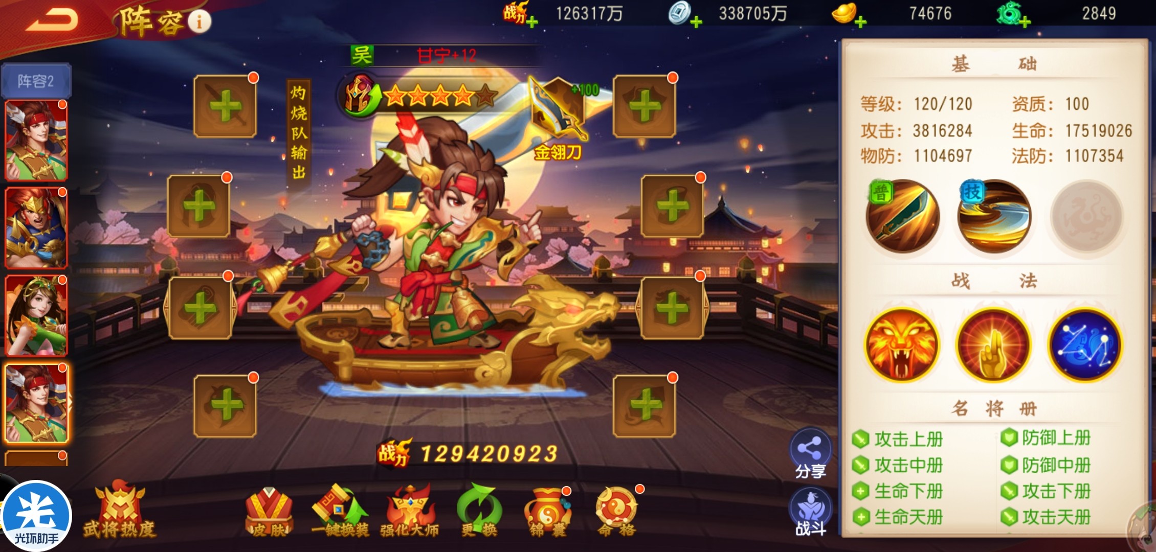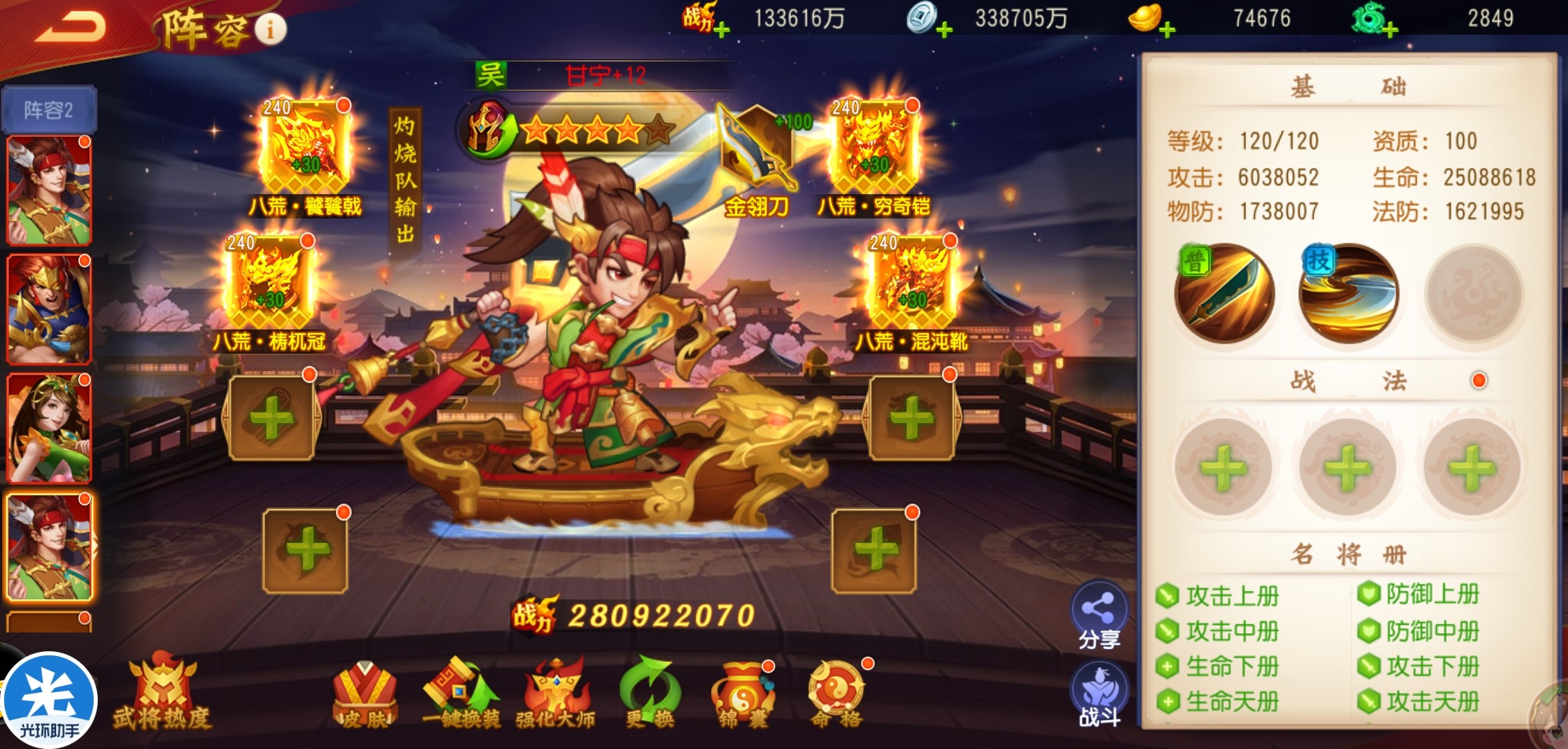 当给主角穿戴装备,同时上阵武将甘宁配置好羁绊武将后对比。