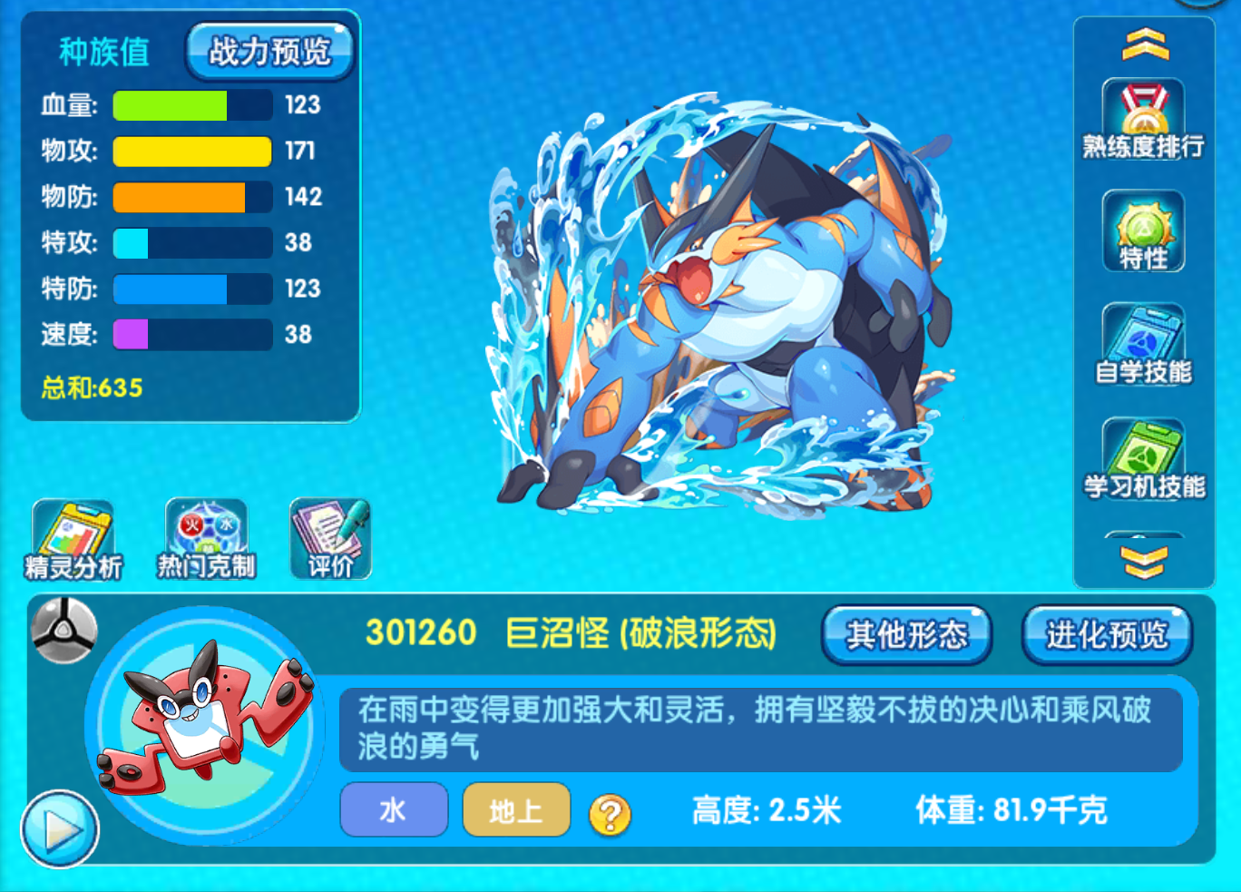还有一个技能就是专门补充打击面的,主要就是可以打一下草属性和飞行属性的精灵,而自己的新特性,只要满足条件,就可以开放雨天,并且,水属性技能越多,回血量就越多,地属性技能越多,伤害就会越高,大家也可以使用泥偶替身,进一步增加伤害,同时,这个技能也可以让对面陷入混乱状态,总体来说会比较不错的