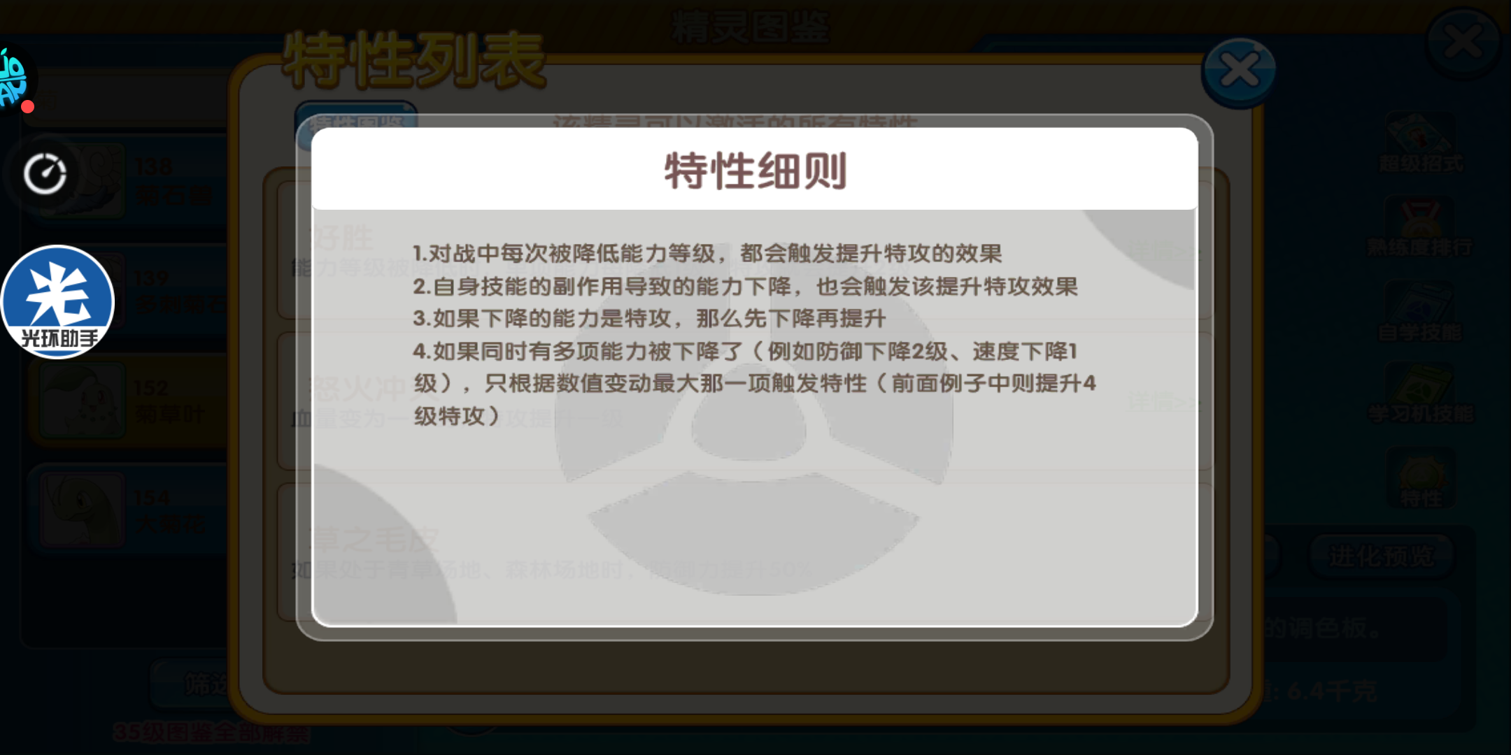 超级大招方面,推荐开启超级亿万吸收,在强化起来后,对于一些不抵抗草系的精灵,都能起到先手斩杀并回血的作用,总体从pvp打架而言,能抗能输出反打的菊草叶其实要比君主蛇更加全面。